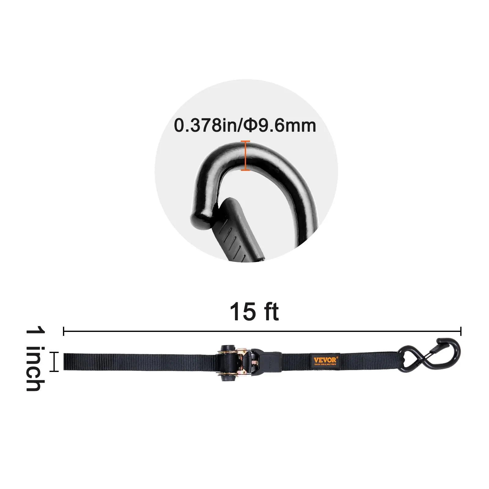 The VEVOR ratchet and hooks are coated to withstand the elements and made of sturdy steel, ensuring long-lasting durability and reusability.