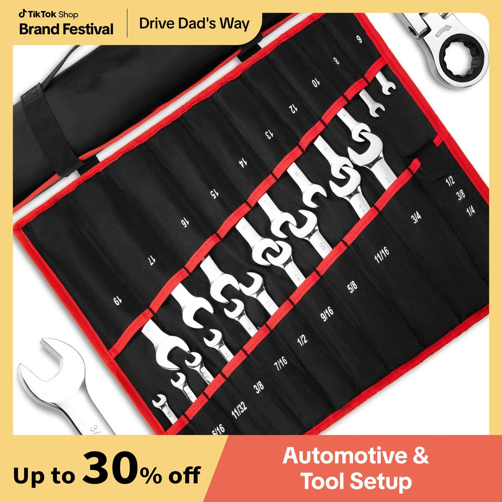 Package Included : 10 Metric Ratchet Wrenches: 6mm, 8mm, 10mm, 12mm, 13mm, 14mm, 15mm, 16mm, 17mm, 19mm; 10 SAE Ratchet Wrenches: 1/4″, 5/16″, 11/32″, 3/8″, 7/16″, 1/2″, 9/16″, 5/8″, 11/16″, 3/4″; 1 Roll-up Storage Pouch