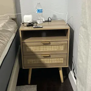 Night Stand with 2 Rattan Drawers and Wood Legs