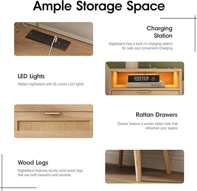 Special Feature: Charging Station, LED Lights, 2 Rattan Drawers, WoodLegs