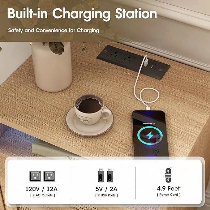 Vabches Rattan Nightstands with Charging Station and Led Lights