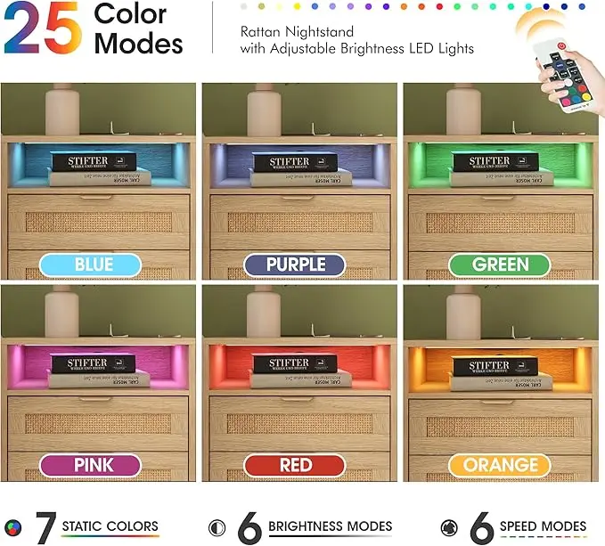 Aesthetic Furniture: Combining classic and modern styles, this oak-toned bedside table with rattan-decorated drawers exudes a natural bohemian vibe. The hand-woven rattan and light luxury metal handle bring a perfect visual effect, and the LED light strips with 25 color modes, 6 speed modes, and 6 brightness modes add color to your life.