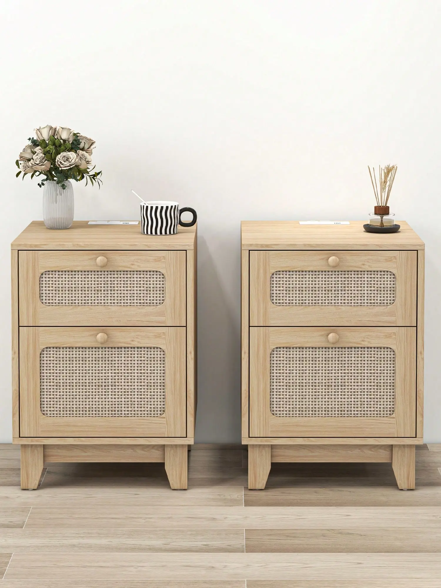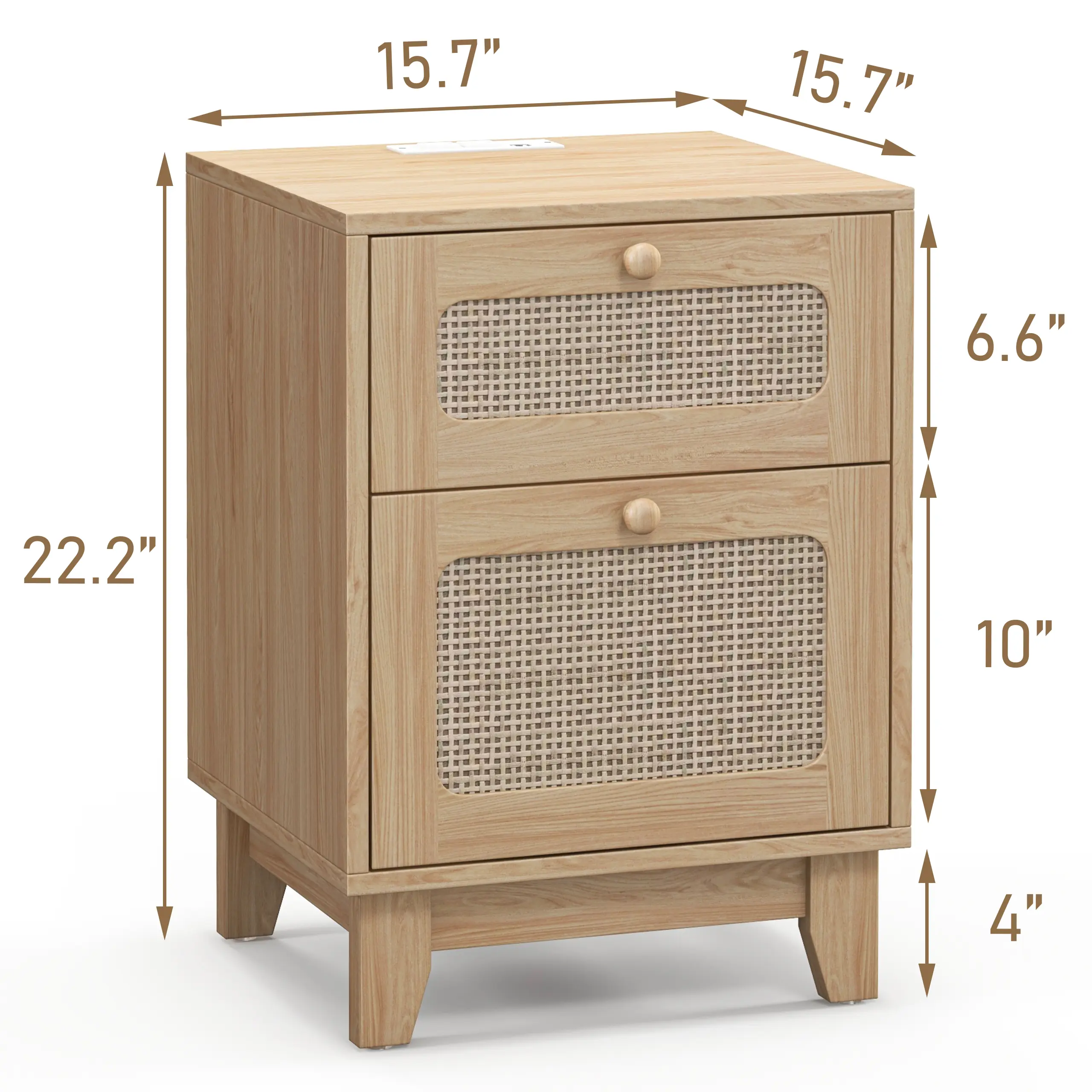 Topwin Modern Rattan Nightstand Set of 2 with Drawers,Charging Station,and LED for Bedroom or Bedside Table Furniture Home Minimal Design Storage