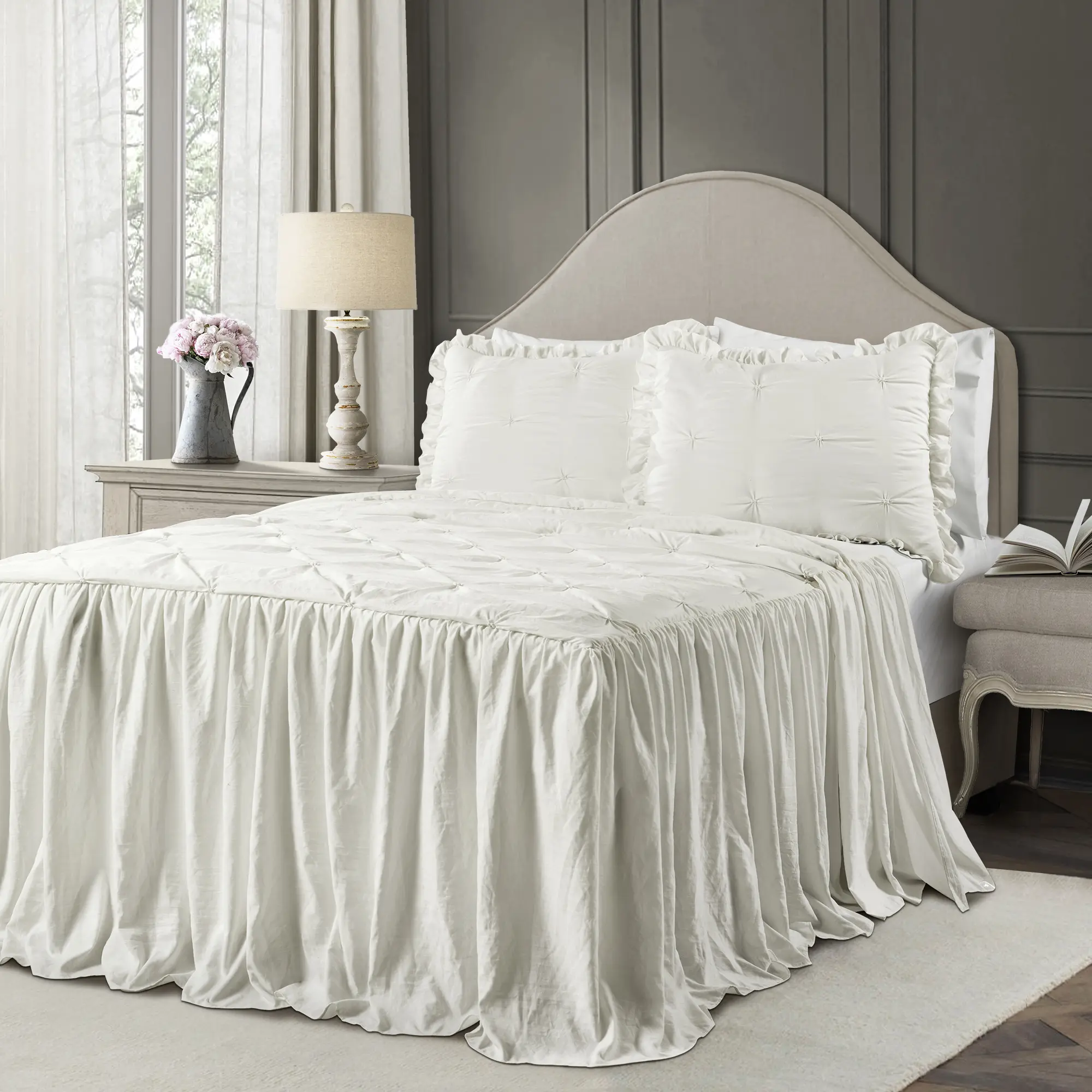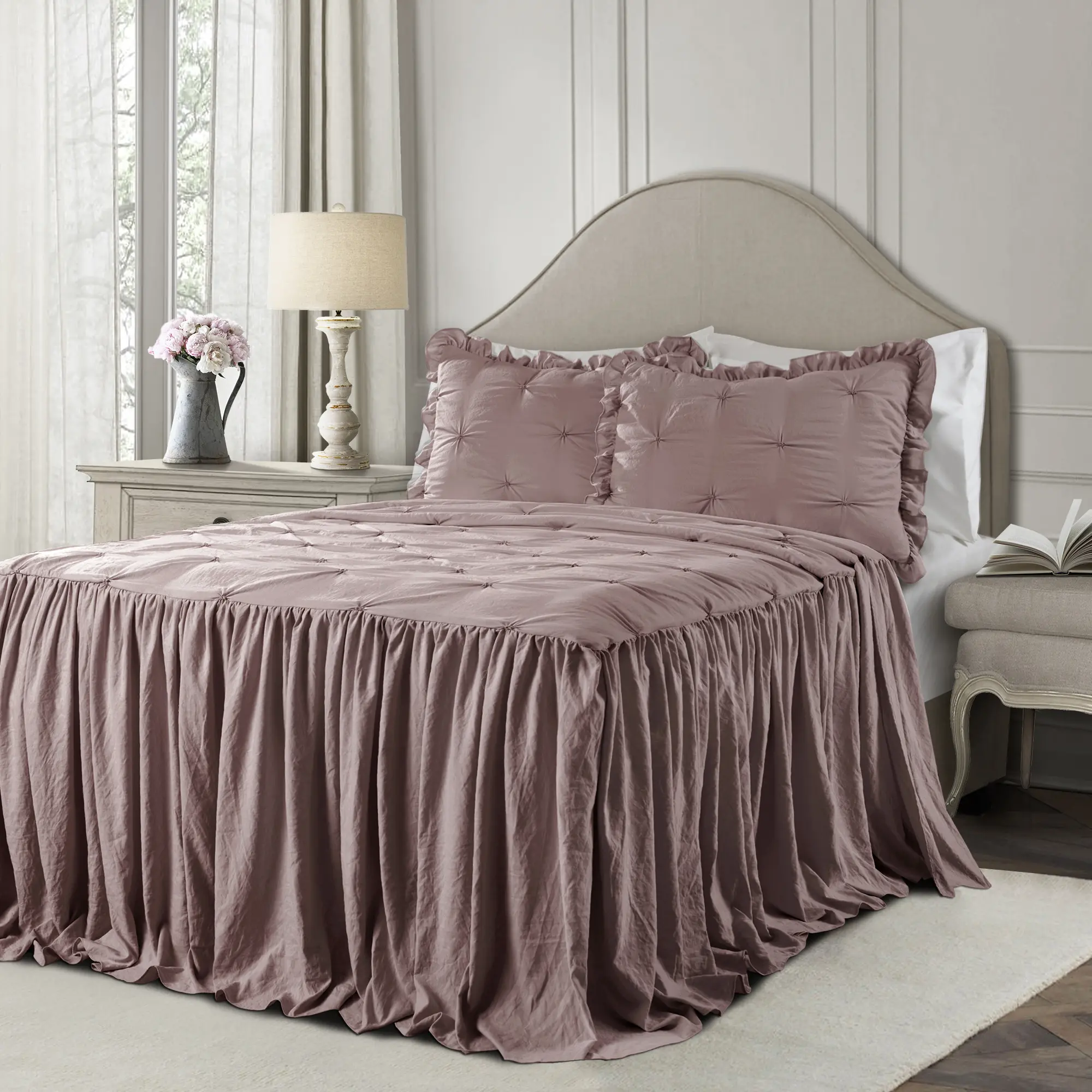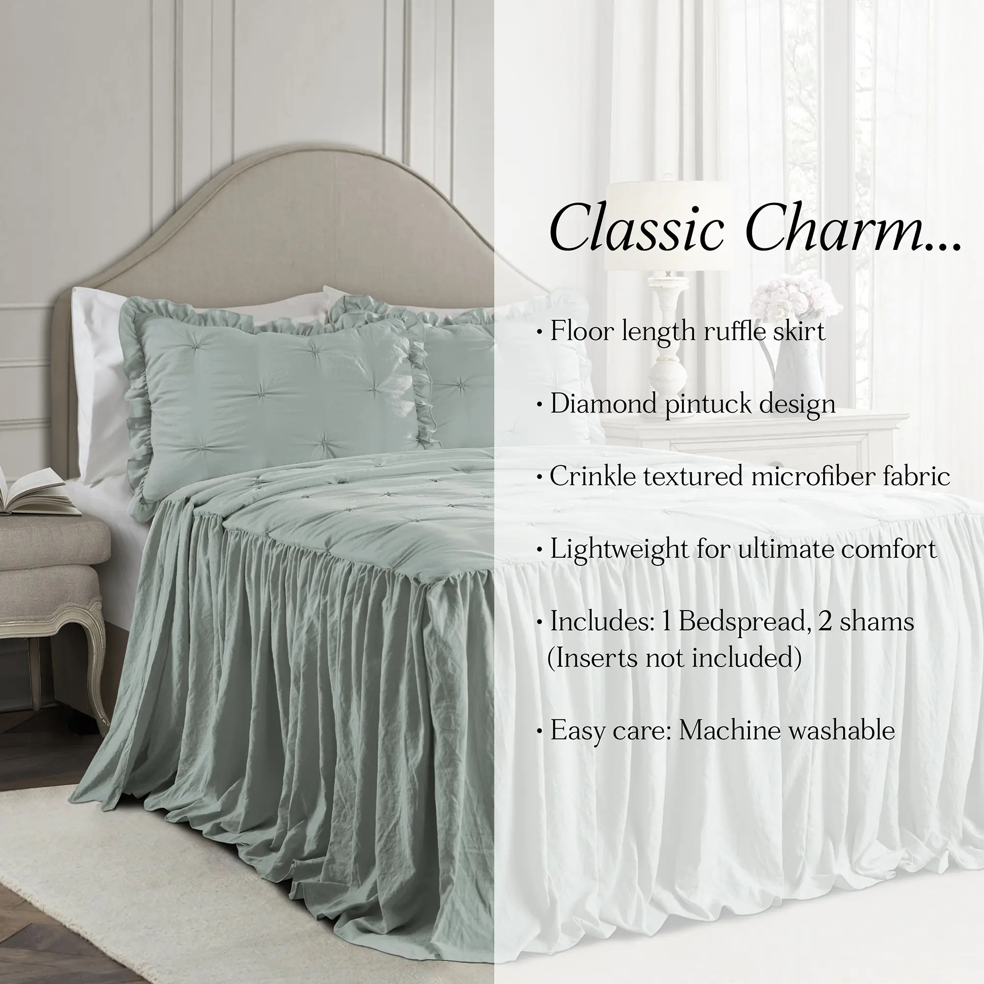 The Ravello Pintuck Ruffle Skirt Bedspread Set is soft and luxurious, featuring hand tucking detail on crinkle Microfiber. It has elegant ruffled edges, perfect for farmhouse, minimalist, or traditional bedrooms. Available in five colors, it enhances any bedroom or dorm room. The set includes one bedspread and two matching pillow shams.