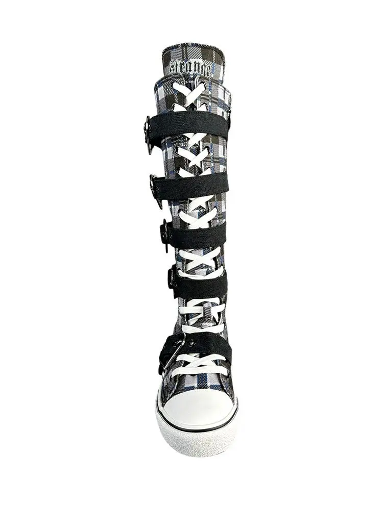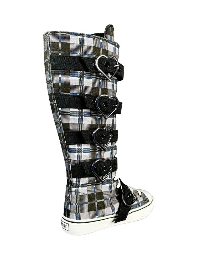Step out in style with the RAWR XD HEARTS - BLACK PLAID sneakers. Featuring a black and grey plaid canvas upper, these kicks bring a bold, edgy vibe with chrome heart buckles. The inner zipper and elastic goring make slipping them on and off a breeze, while adding a comfy stretch. Perfect for those who want to mix playful charm with easy wearability.