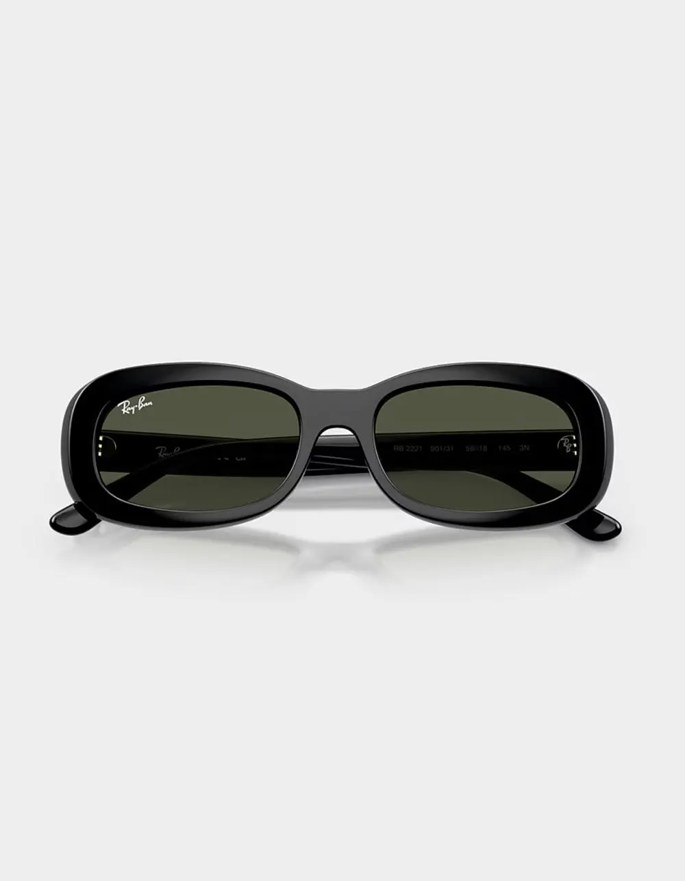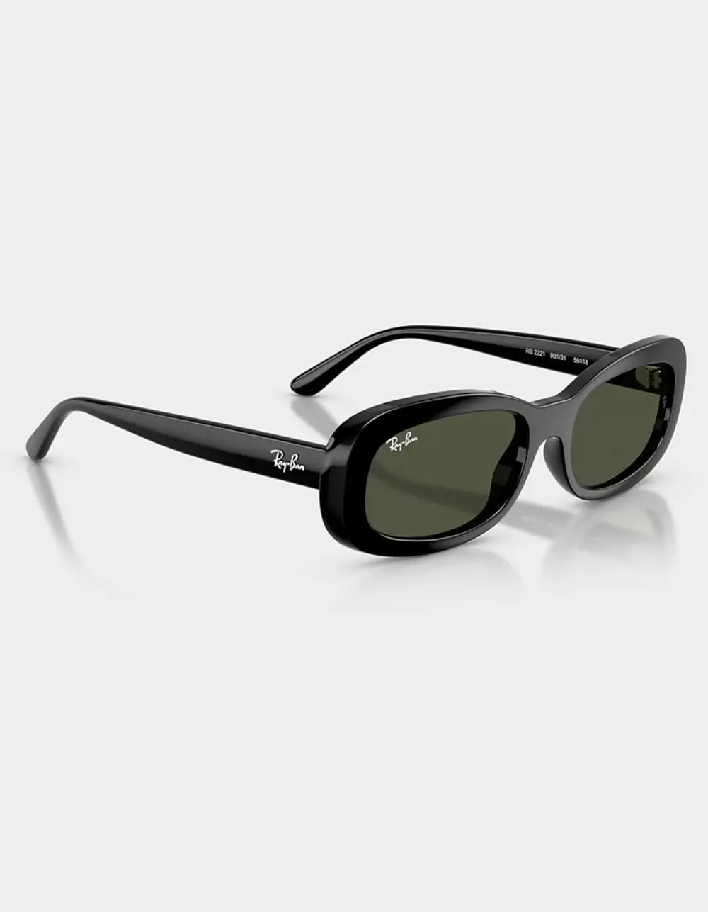 Ray-Ban RB2221 Sunglasses. Ray-Ban RB2221 sunglasses in black with green lenses are a sleek and stylish choice for any occasion. The oval shape and polished finish add a modern touch, while the solid color lenses provide 100% UV protection. These sunglasses are perfect for adding an edgy flair to your look. High bridge fit. 53 18mm size. 34.5mm lens height. 145mm temple length. Imported.     CALIFORNIA PROPOSITION 65 WARNING: This product can expose you to the chemical Nickel (Metallic), which is known to the State of California to cause cancer, and Bisphenol A (BPA), which is known to the State of California to cause birth defects or other reproductive harm. For more information go to www.P65Warnings. ca. gov. California Health & Safety Code Section 25249.6