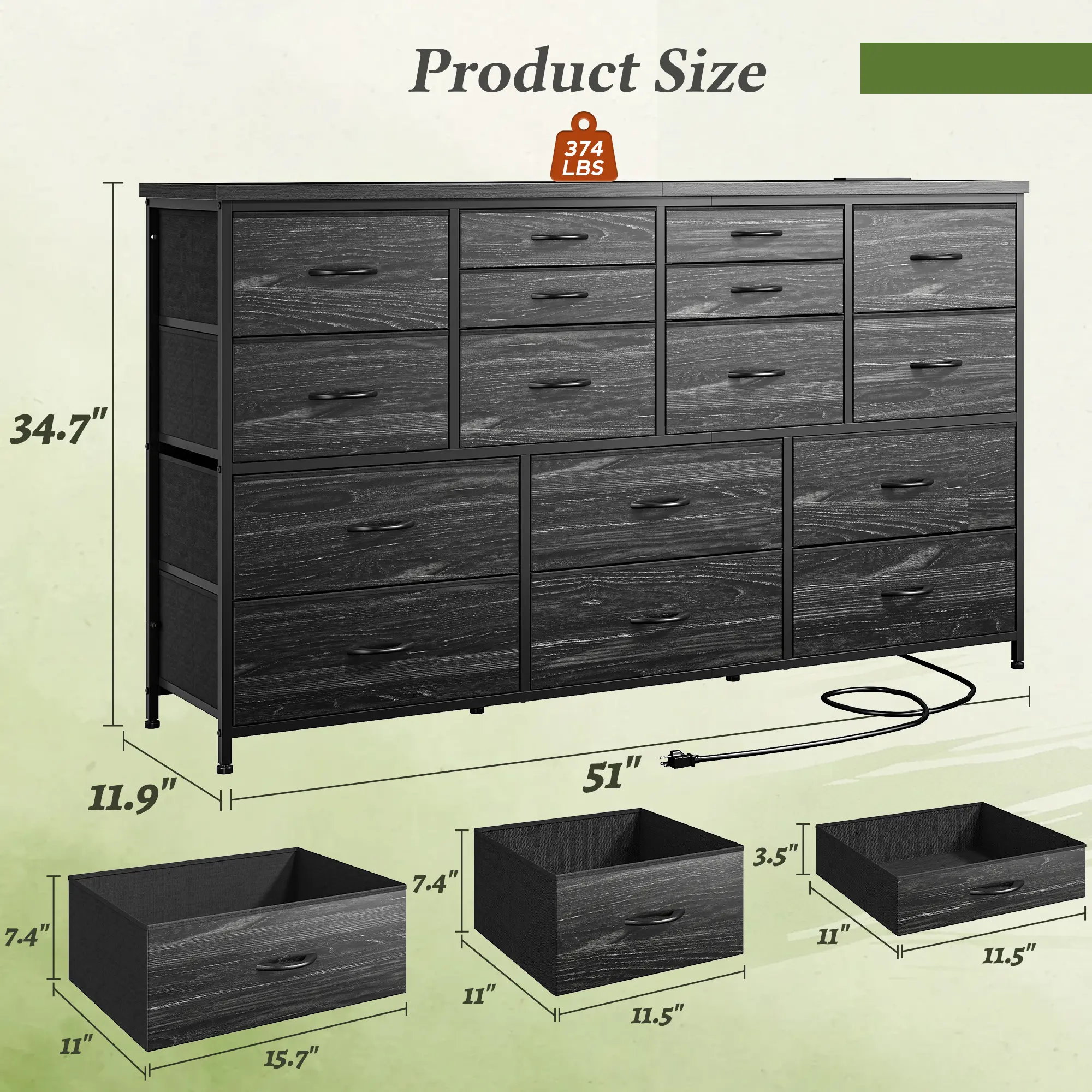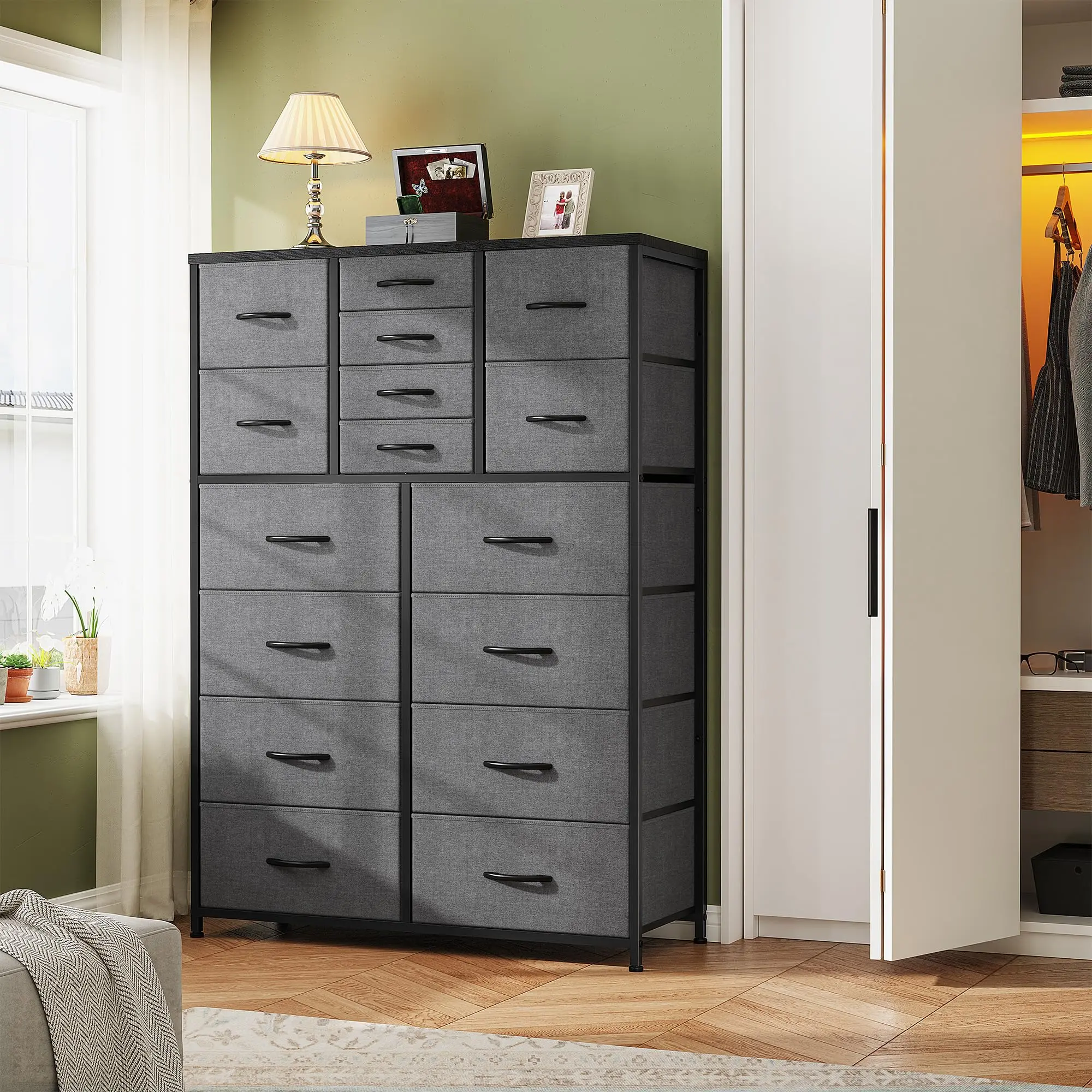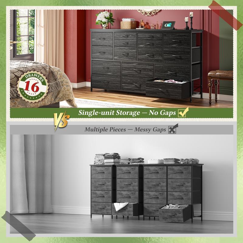 ·Spacious Storage Solution: This 16-drawer dresser boasts ample storage with its 51.1"W x 11.8"D desktop and deep fabric drawers, perfect for keeping your clothes, media, and accessories neatly organized.