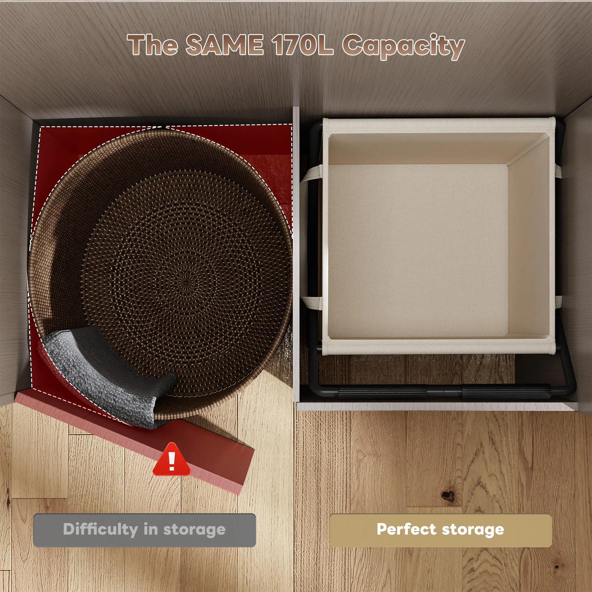 Square shape tucks perfectly in that awkward closet corner. Bye-bye, wobbly round baskets!!!