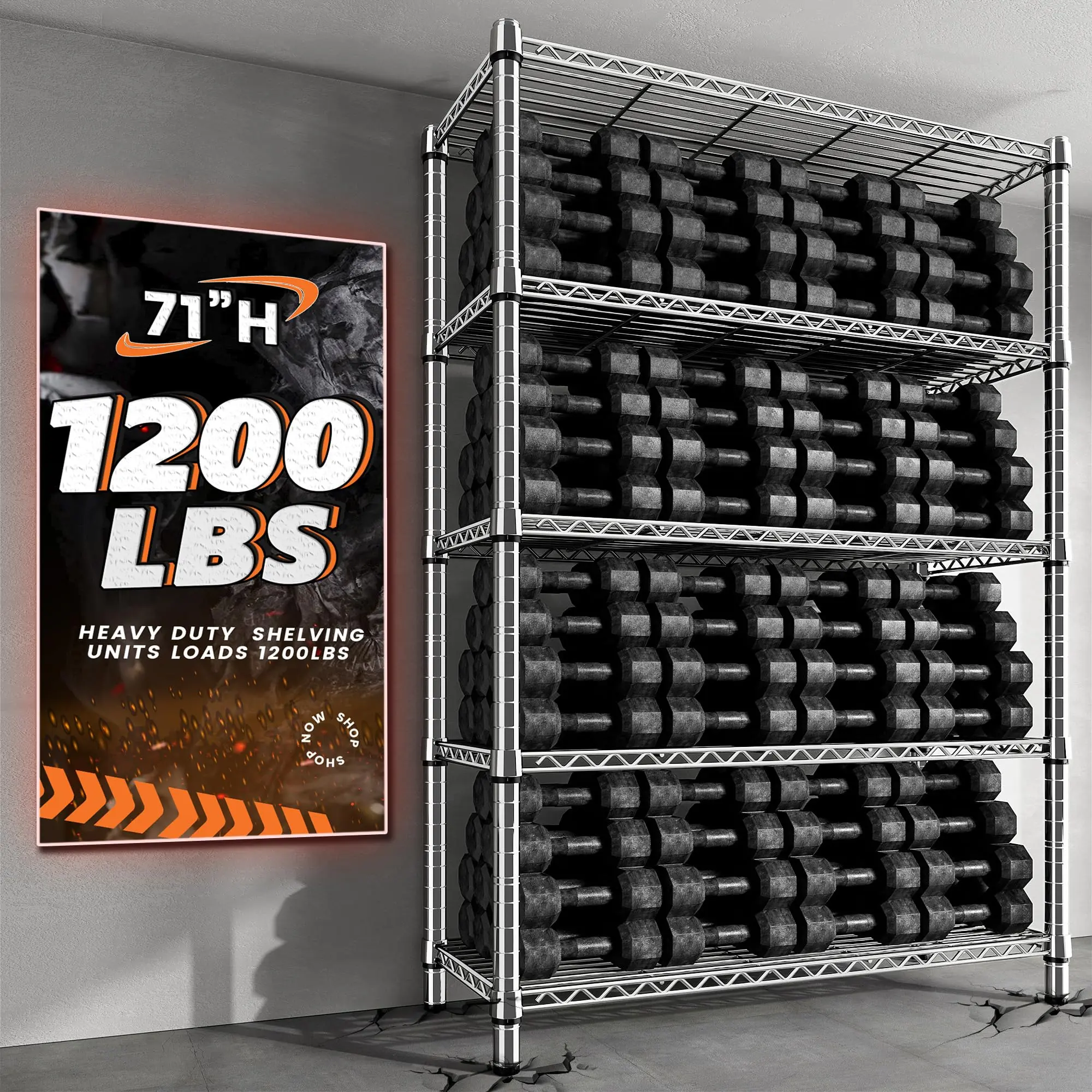 Β·γ1200LBS Capacity Super Sturdy Storage Shelves γ Industrial-strength steel wire with chrome finish and 19.1 mm diameter metal rods made this wire shelving. Each panel is reinforced at the bottom for extra strength, it ensures that this metal shelves holds 240 LBS per tier and 1200 LBS overall!These wire racks for all of your home organization or commercial shelving needs