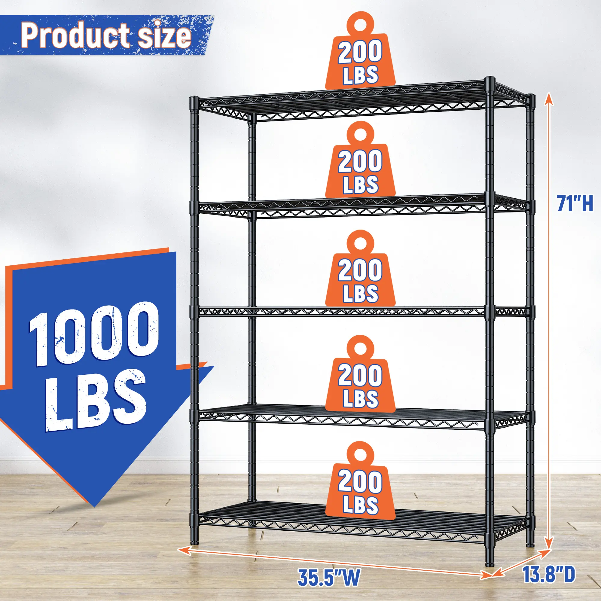 Β·γ71''HX 35.5''W X 14''D Larger capacity Metal Shelving unitγ Heavy duty shelving with suitable size-71''HX 35.5''W X 14''D. It can provide you an enormous storage space without occupying too much space. The appropriate size makes the metal shelves for storage suitable not only for your garage, kitchen, pantry, but also for commercial use. Itβs great addition for your home