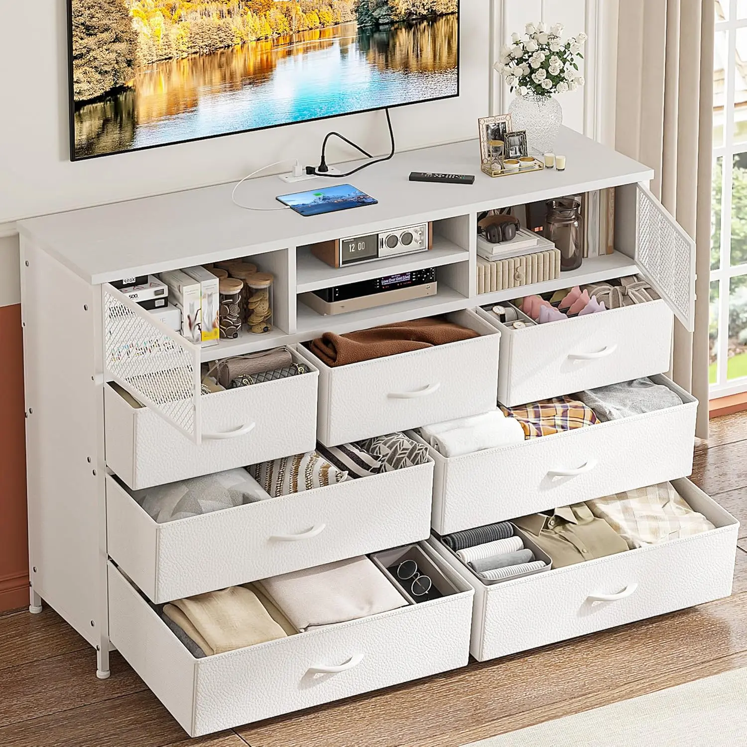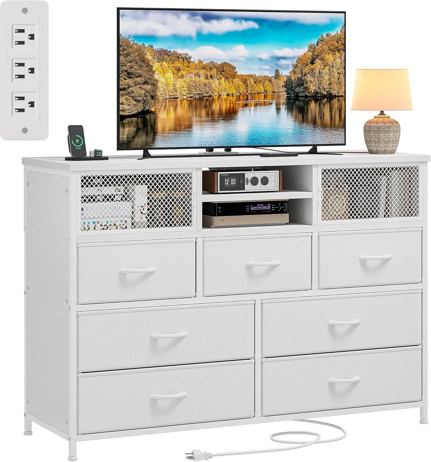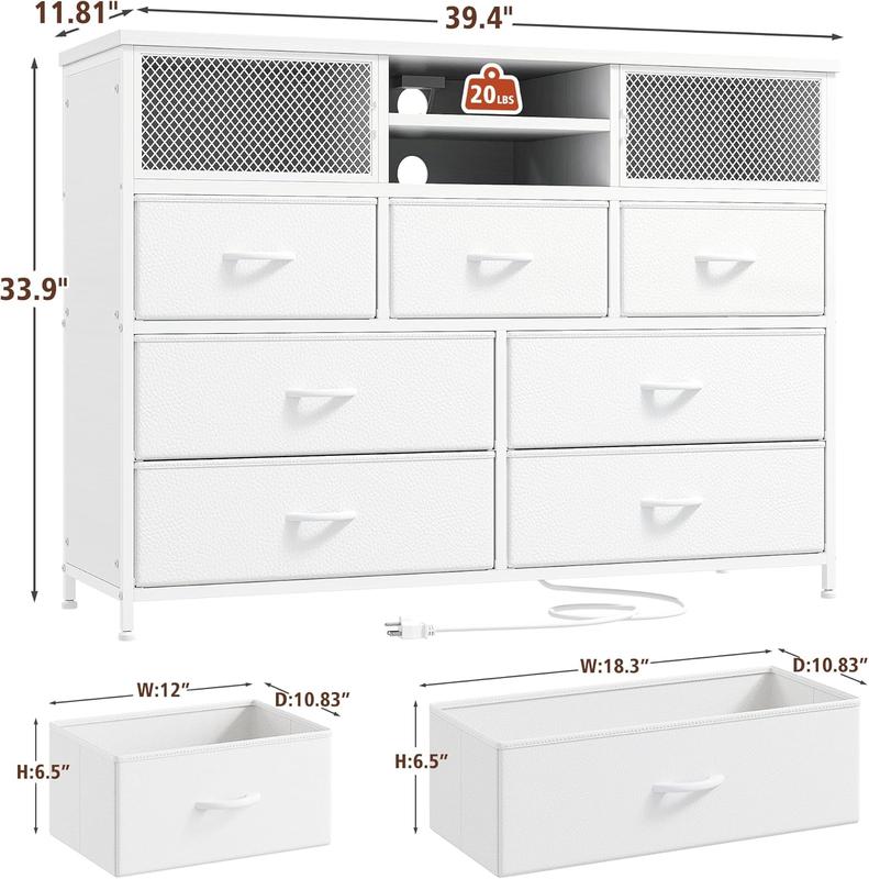 ·【Special TV Stand for Bedroom with Storage】The dresser can meet all your organizing needs! The dresser TV stand with storage has large space and can easily hold 200+ pieces of clothes and socks, freeing up tons of space in your room. Dresser for bedroom has 4 large drawers, 2 medium-sized drawers, 2 wooden shelves, 2 metal net door. STV stand size: 39.4"W x 11.8"D x 33.9"H.