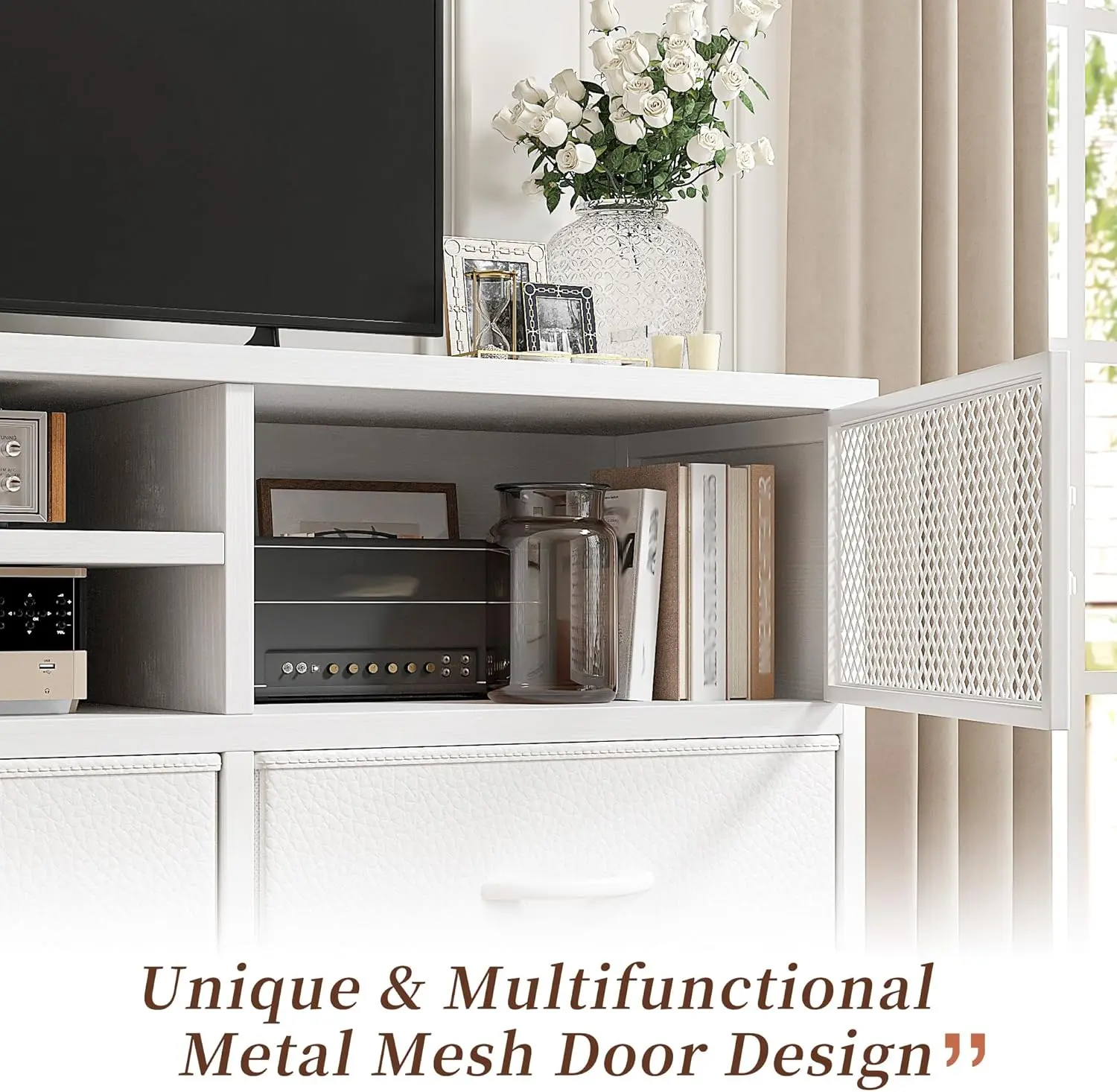 ·【New Console Table with storage Metal Mesh Doors】Multi-functional dressers for bedroom meets your various storage needs.Dresser's wooden shelves part is perfect for organizing DVDs, small speakers, books and more!