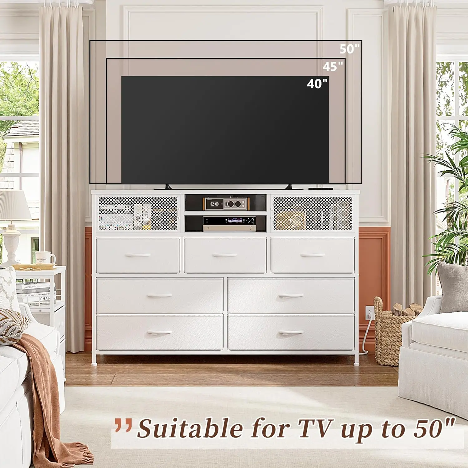 ·【Entertainment Center with Power Outlet for 50" TV】The wooden tabletop of the dresser TV stand is thickened and can bear 111 LBS, making it ideal for 50" television. The metal frame is so solid that you don't have to worry about the safety of your TV. Tip: The distance between the support feet on the bottom of the TV is less than 39".