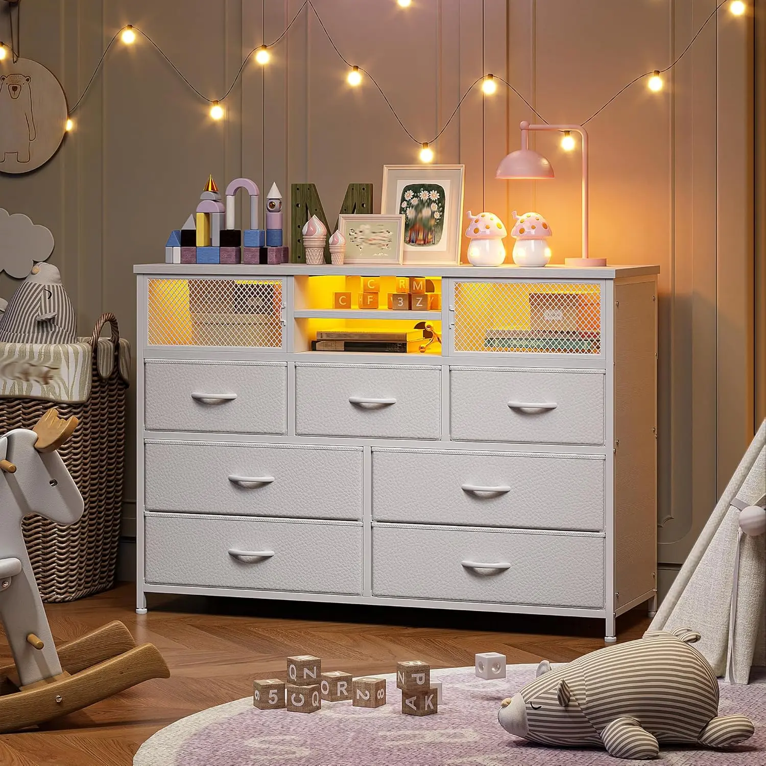 ·【Dresser Organizer Drawers Made of Durable and Healthy Materials】The wide dresser are made of high-density healthy cationic material and fiber wood base, very breathable and durable, each drawer can hold up to 14 pounds of weight, which is the same as the holding weight of wooden drawers.