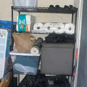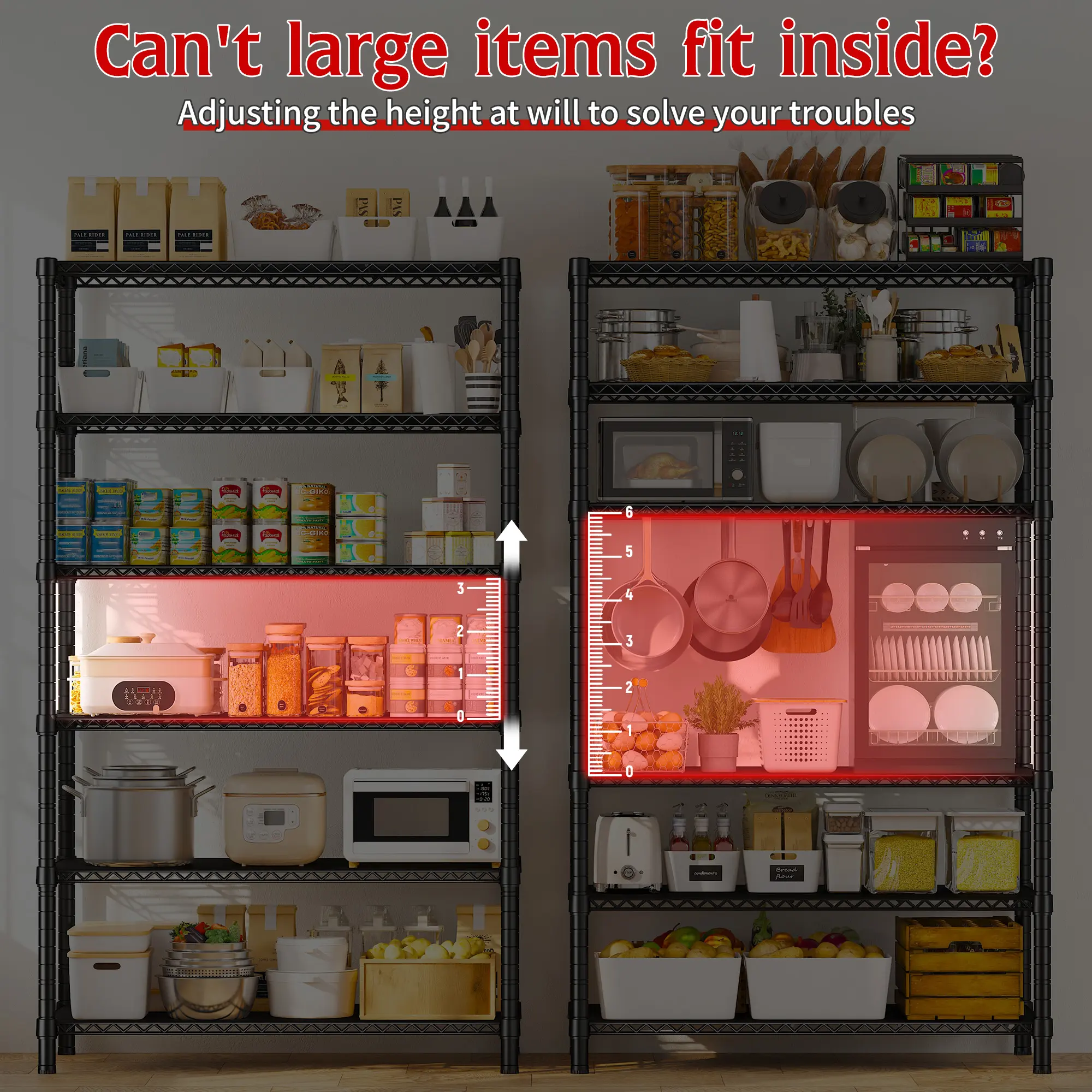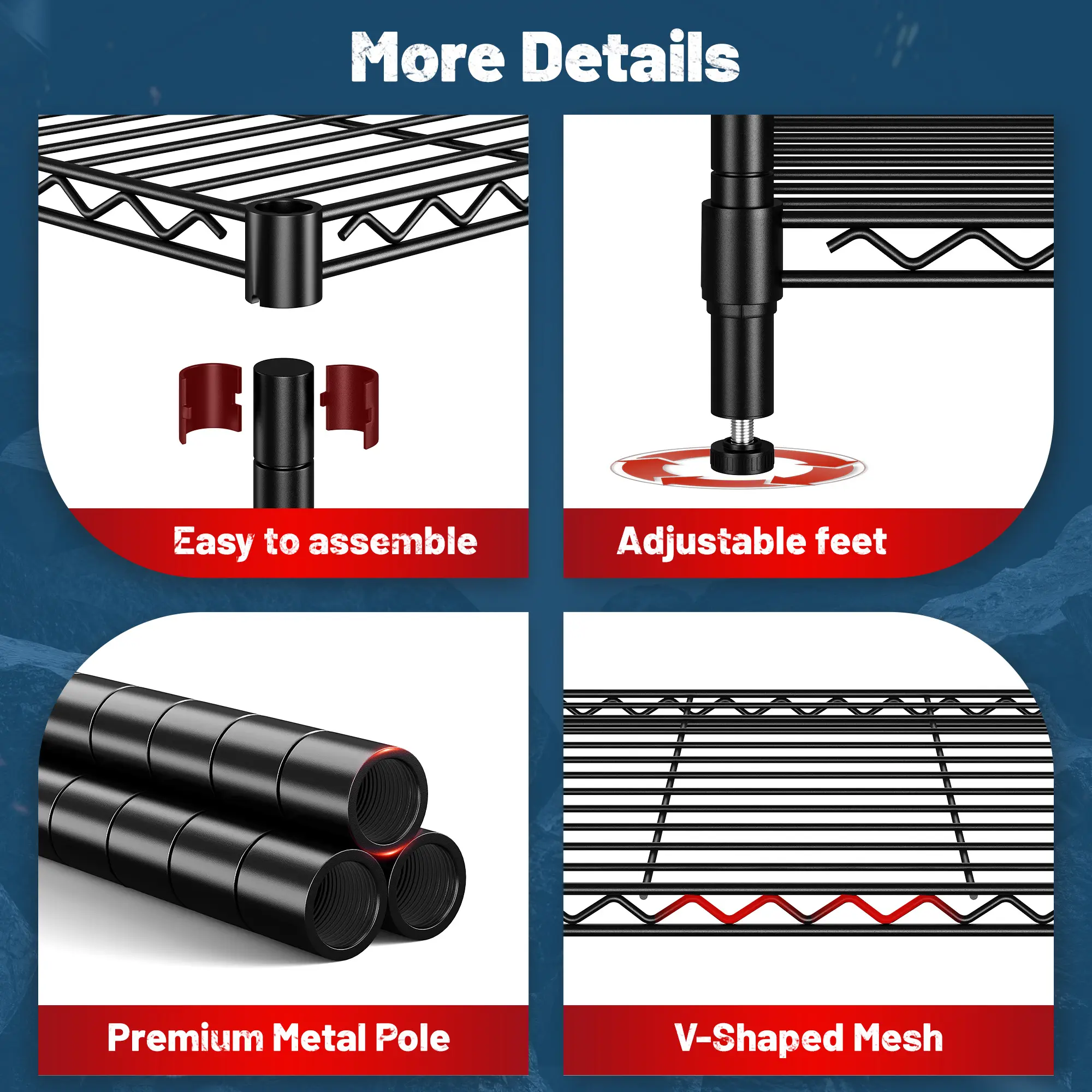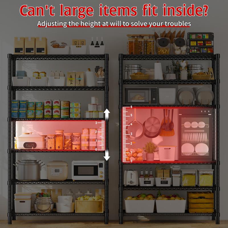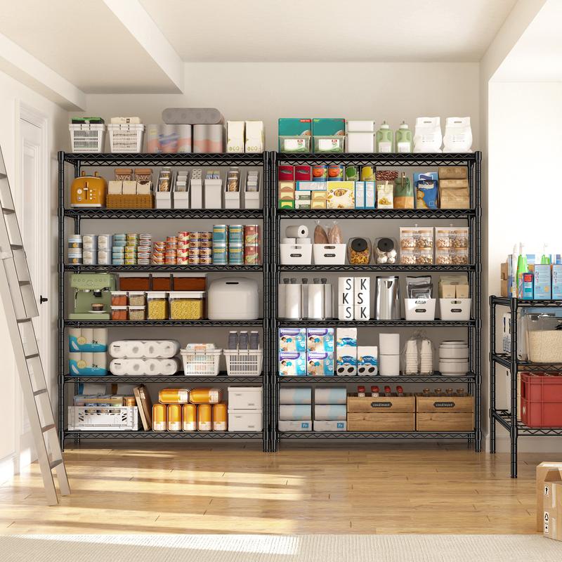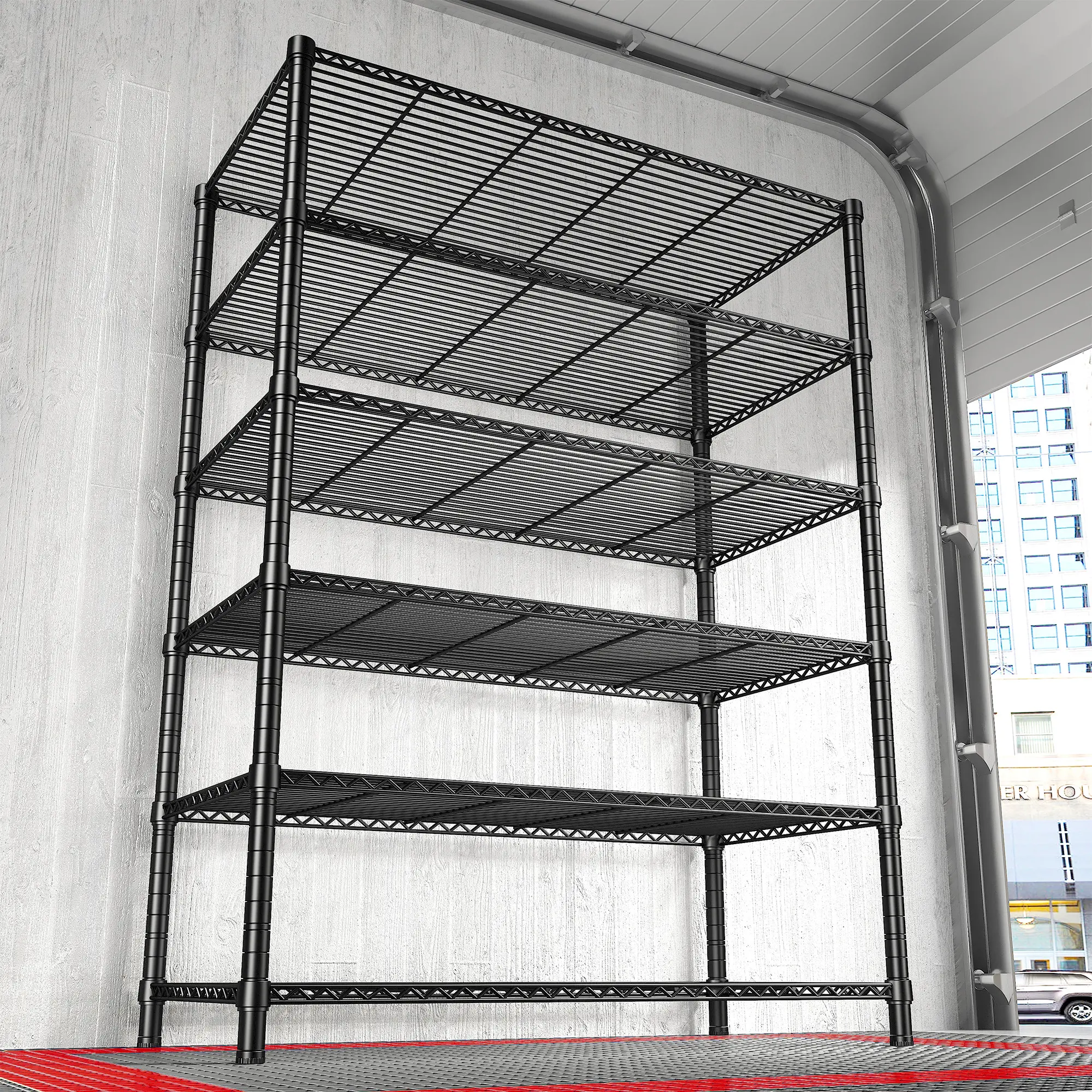 Customize your space with the adjustable 5-tier shelving unit. Adjust the height of each layer by moving the crossbar up or down. The unit can also be divided into two individual shelves for added stability. Easy to set up and customize.