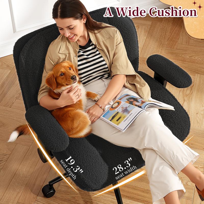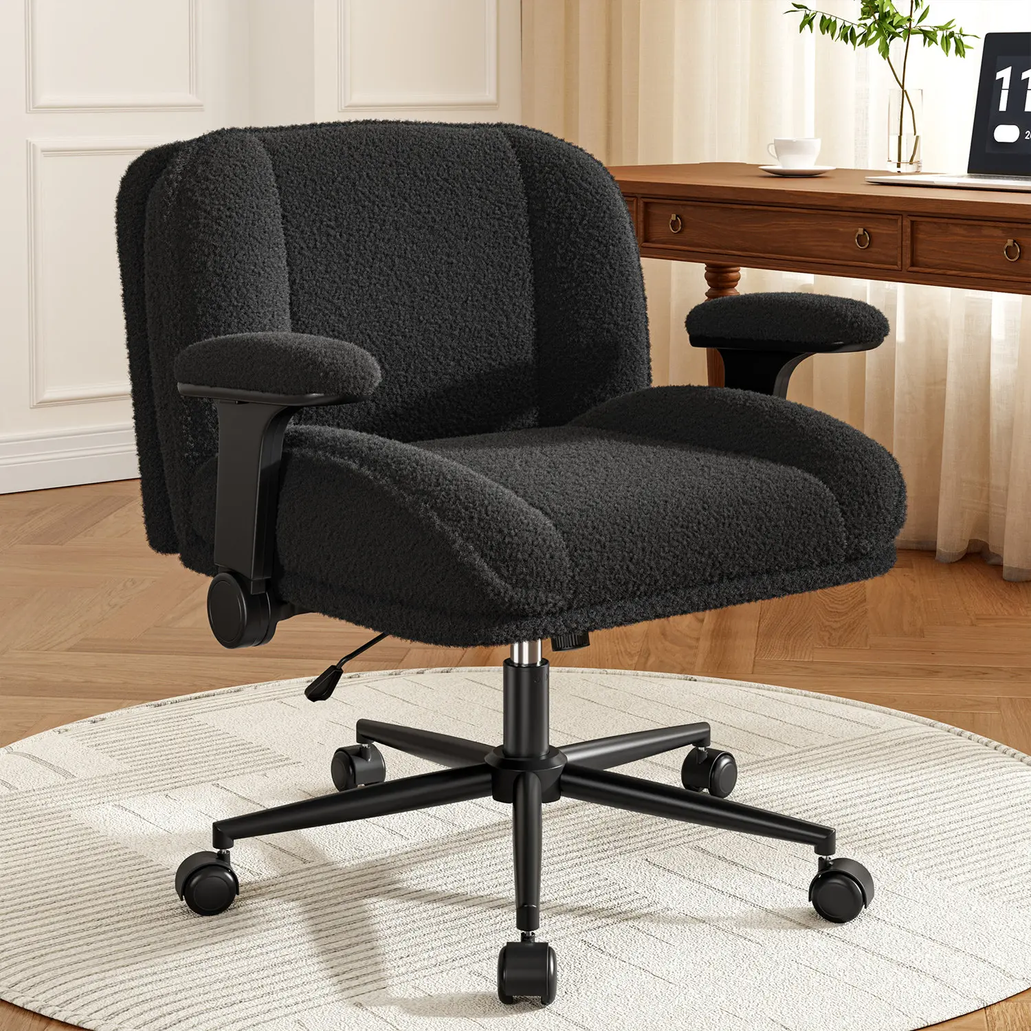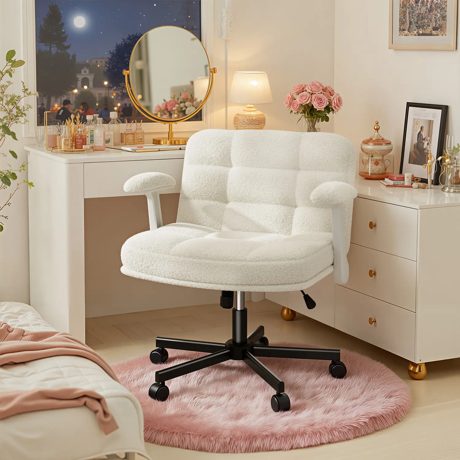 Elevate your workspace with the Raybee Criss Cross Office Chair. This versatile chair features flip-up arms and wide plush cushion seats, perfect for reading, makeup, bedroom, study, or gaming. The cross-legged design adds a unique touch. Enjoy the comfort of a Teddy Fleece swivel vanity chair. Ideal for various settings, it combines functionality with style.