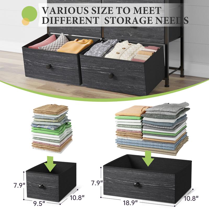 ·Large Capacity with 12 Deep Drawers for Space Saving Organization-Each drawer of this clothes dresser holds 10 lbs. 8 Large drawers’ size 18.9" L x 10.8" W x 7.9"H inch, spacious for clothes, pants, shirts, jeans, dresses, 4 small drawers’ size 9.5" L x 10.8" W x 7.9" H, considerately sorting socks, underwear etc. Tall dresser helps for saving space and keep all clothes sorted and organized.