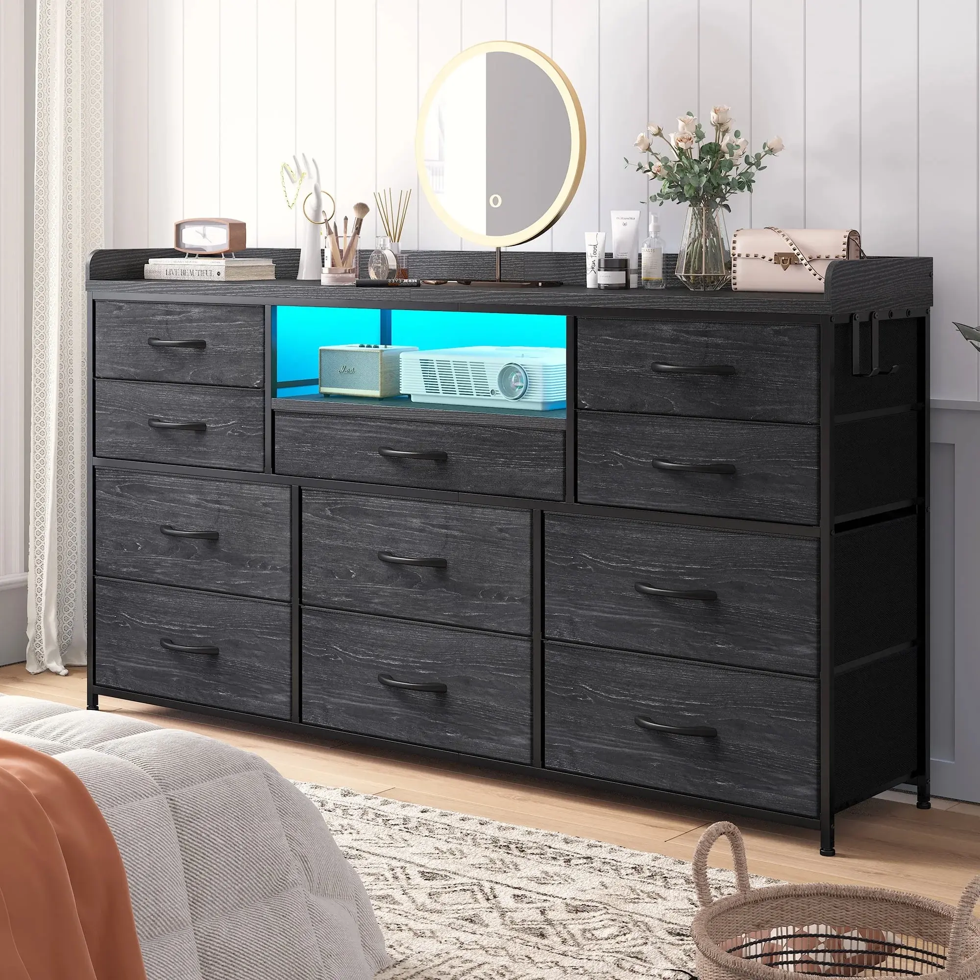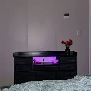 The dresser features LED lights with 21 colors, 22 modes, 10 flicker frequencies, and 5 brightness grades. Control the lighting for any scene. The charging station includes 3 AC outlets and 2 USB ports. Charge your TV and other devices without extra cords. Enhance your room's atmosphere effortlessly.