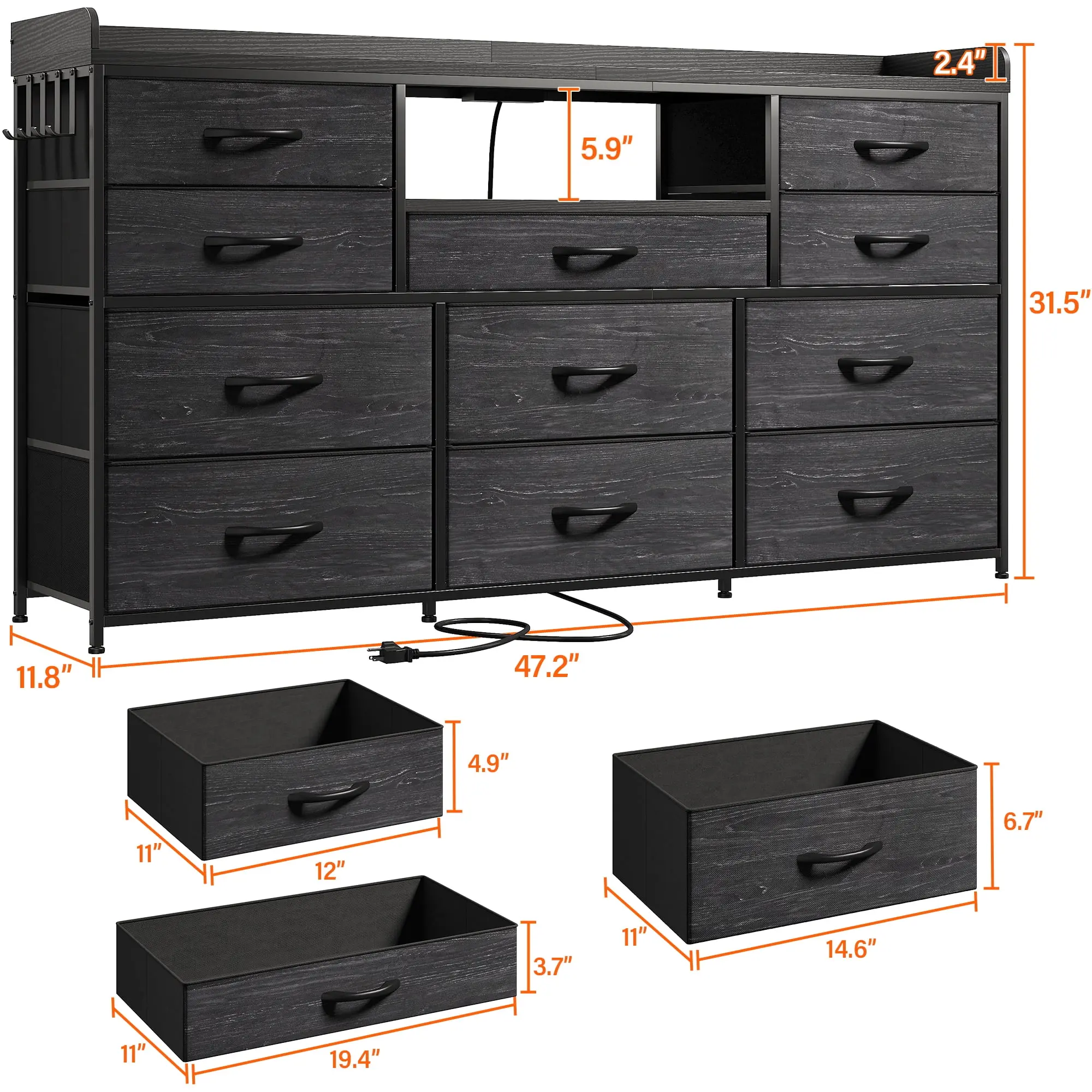 This dresser measures 11.8"D x 47.2"W x 31.5"H. It holds up to 110lbs, perfect for a 60" TV. With 11 deep foldable fabric drawers, 6 large, 4 middle, and 1 small drawer, each holding up to 22lbs, it offers endless organization. The wooden top ensures stability and protects privacy. Ideal for bedrooms, living rooms, hallways, and entrances.