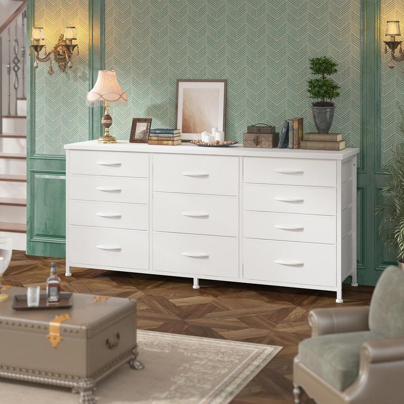 ·【Versatile 11-Drawer Storage Dresser】This versatile chest of drawers features 5 large drawers and 6 small drawers, providing ample categorized storage space to maintain a tidy home.The large drawers are ideal for stacking pants, sweaters, thin blankets; the small drawers can organize undergarments, socks, ties, and other small accessories.Wooden Top Surface: Sturdy and weight-bearing, perfect for placing plants, fragrances, books, or daily essentials to maximize space utilization