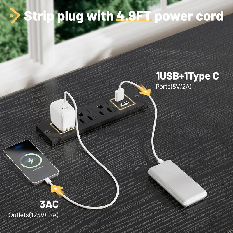 This compact desk comes equipped with a charging station. It includes 5 power outlets, 3 AC outlets, 1 USB port, and 1 Type-C port. Charge up to 5 devices simultaneously. Keep your workspace tidy and free from tangled wires. Perfect for modern tech users.