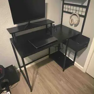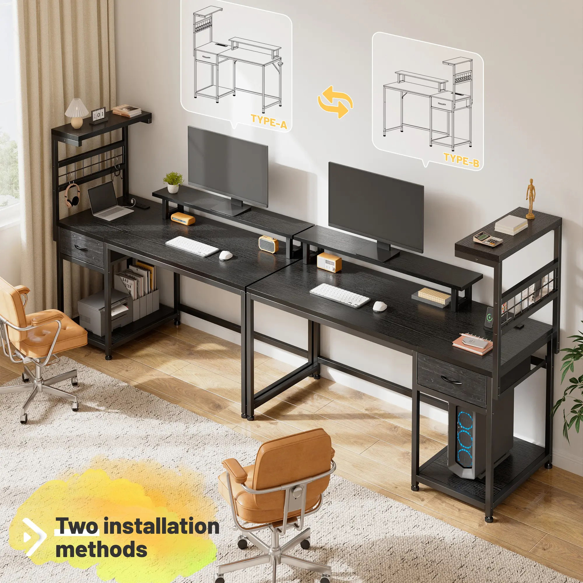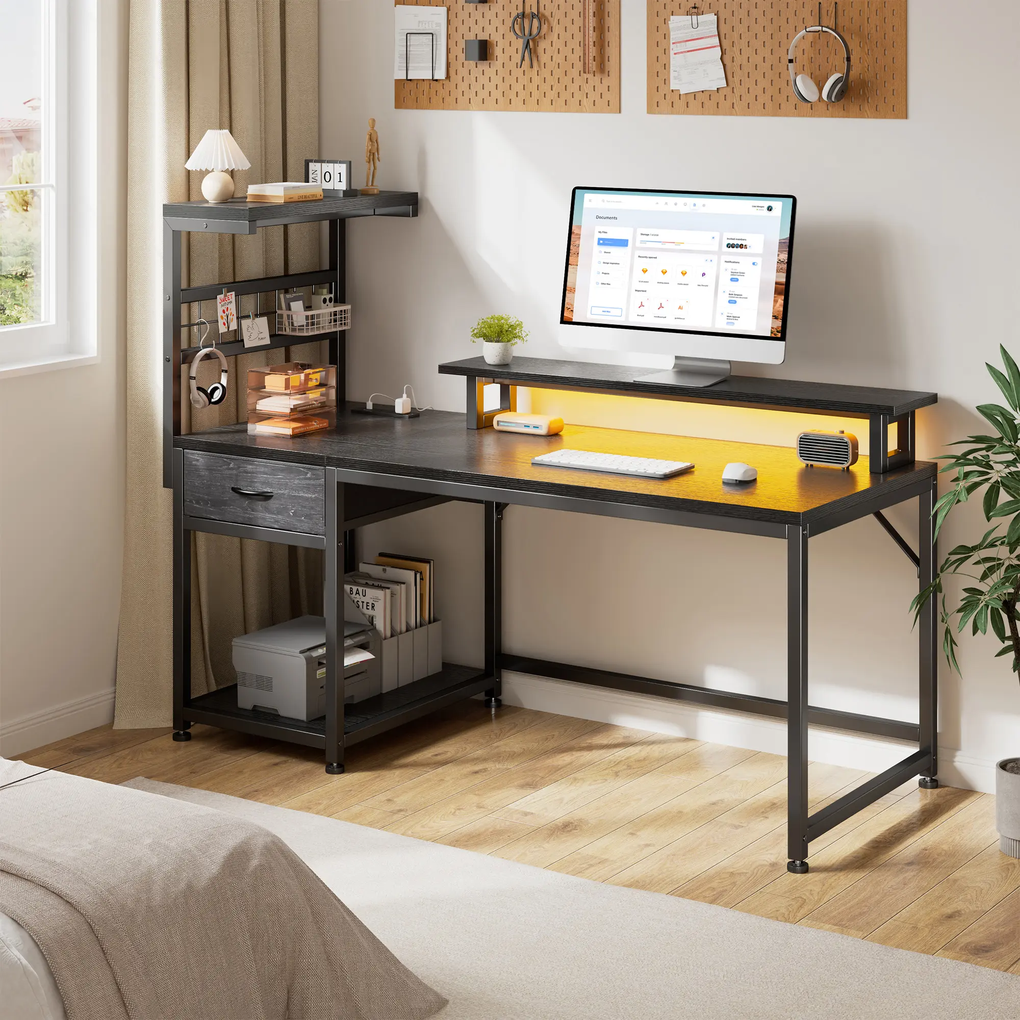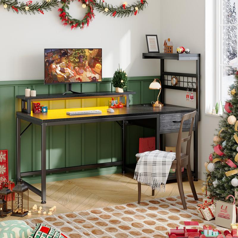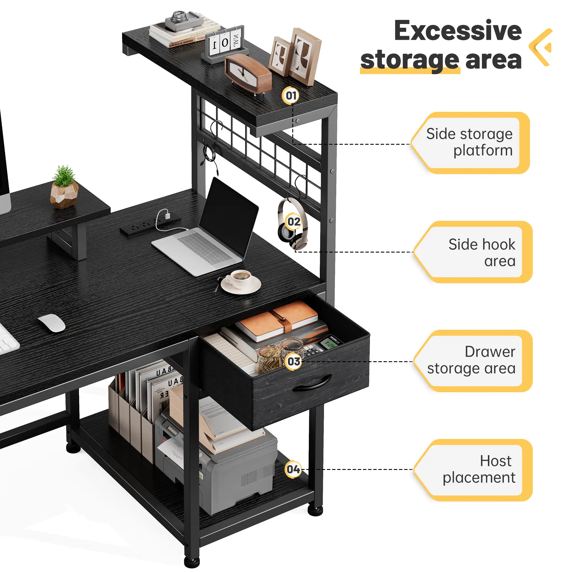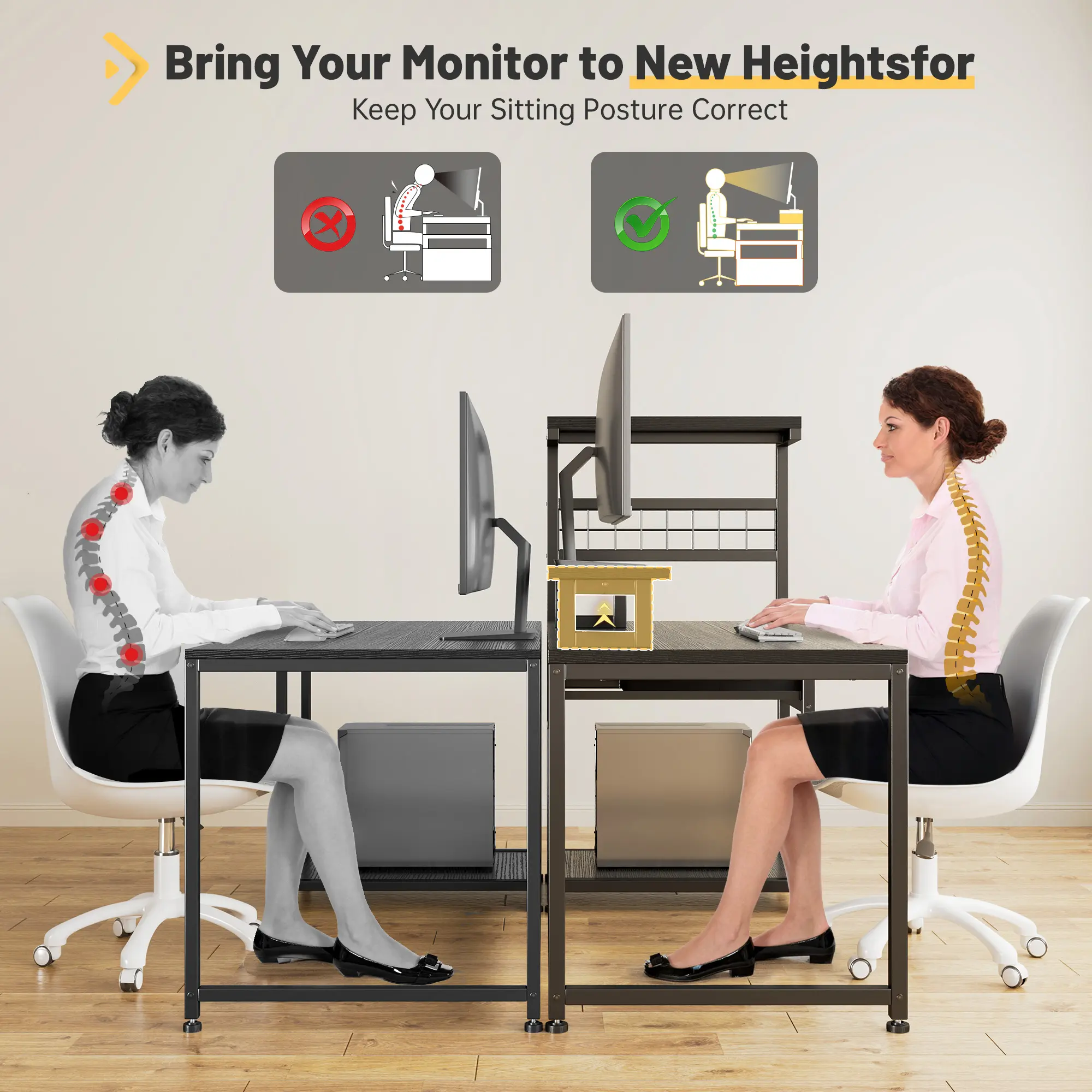 The gaming desk includes an ergonomic monitor stand. It measures 28.2"W x 7.1"D, raising the screen to eye level. This reduces neck and back strain. The reversible design fits both left and right corner setups effortlessly.It can very effectively relieve the tension of neck and waist muscles after sitting for a long time, and significantly reduce the possibility of cervical spondylosis and lumbar spondylosis.