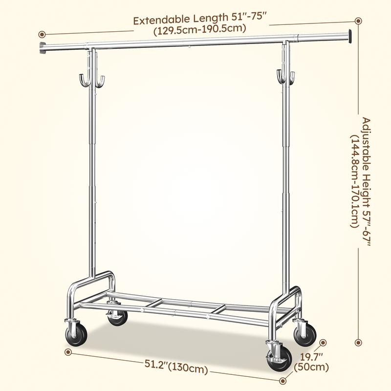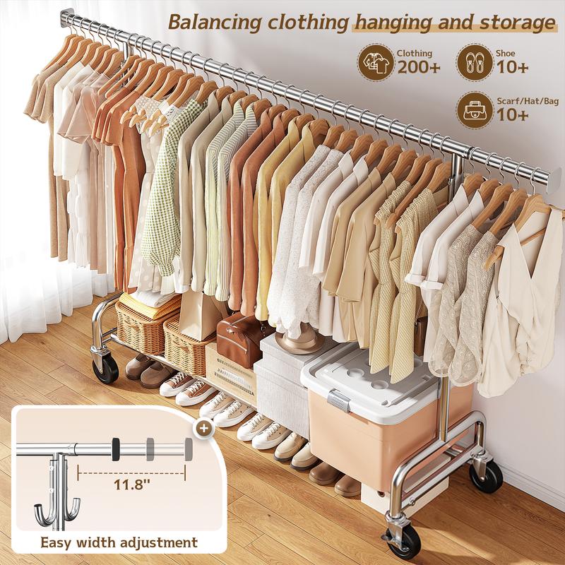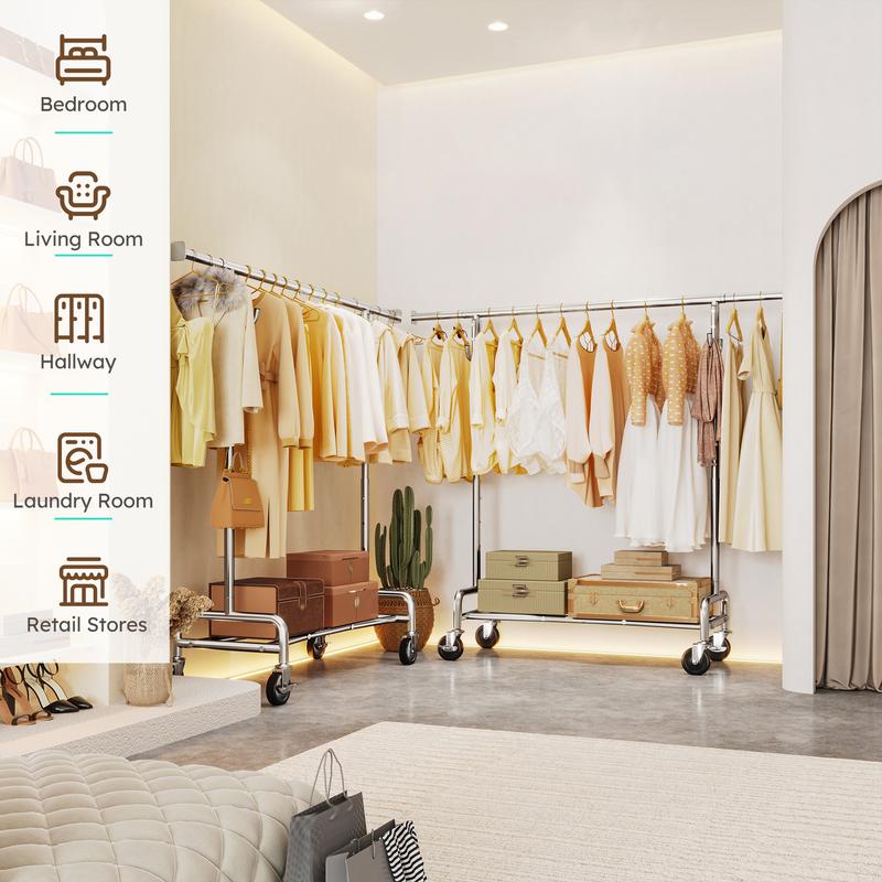 ยทHeavy Duty Clothes Rack -Crafted from premium metal, Raybee clothing rack holds up to 450 lbs with wheels locked and 220 lbs while moving, making it perfect for heavy coats and menswear. The chrome-plated finish adds durability and a sleek, modern look.