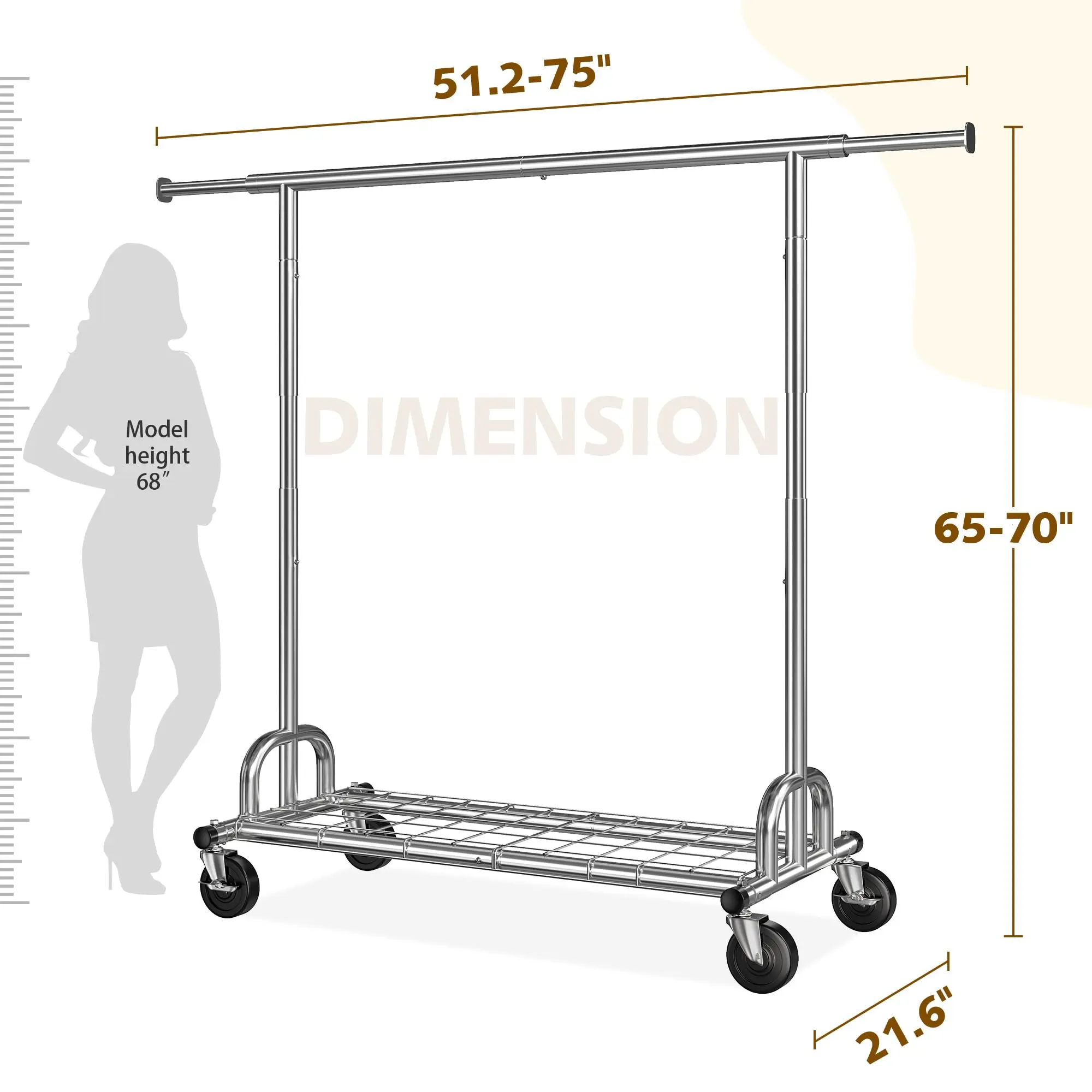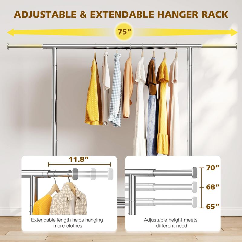 ·【Adjustable and Extendable Clothes Rack Heavy Duty】The extensible horizontal rods of double rail garment rack from 51.2" to 75", providing 3 times space than ordinary single rail rolling clothes rack. Height adjustable from 65" to 70" accommodates short and long garments.You can adjust the length and height of rods to meet your space needs.