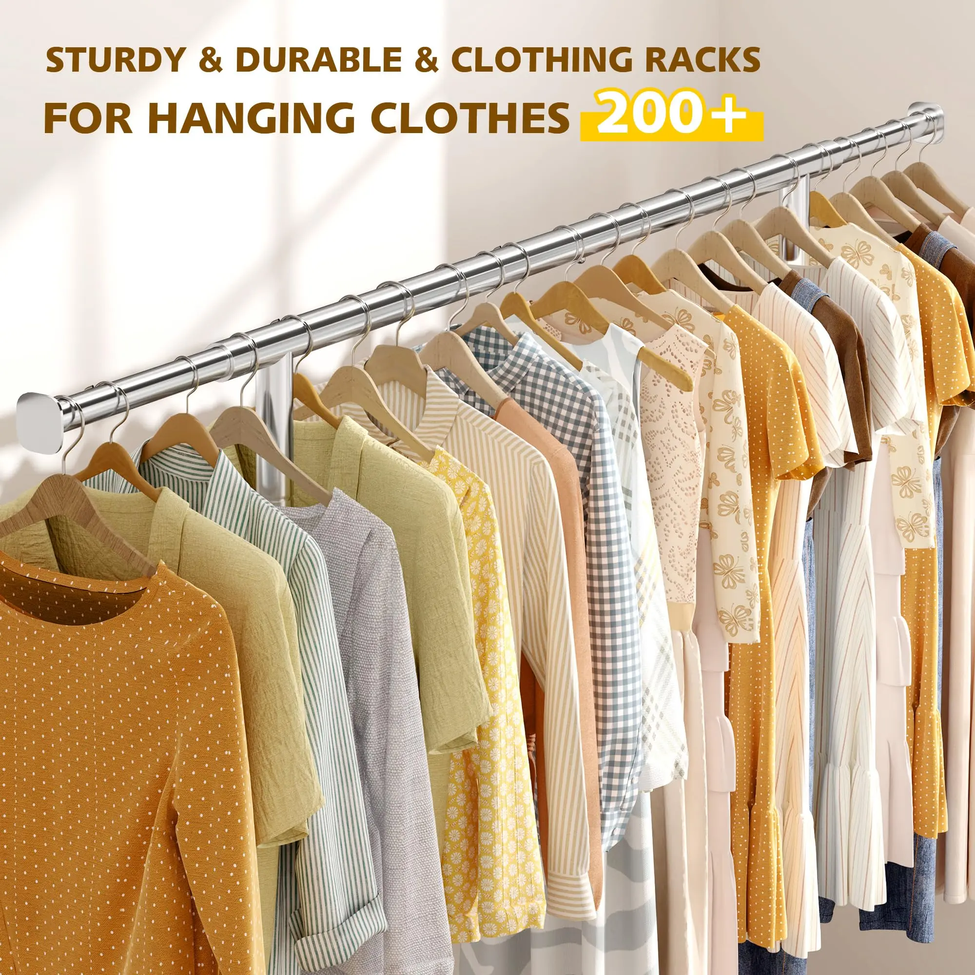 ·【Sturdy & Durable & Clothing Racks for Hanging Clothes 160+】Dimension: 51.2-75" L x 21.6" W x 65-70" H. The heavy duty clothes rack with 220LBS capacity is made of 1.5 mm thick metal(thicker and sturdier), and a thick layer of chromium coating on the surface can improve the hardness, wear resistance, temperature resistance and corrosion resistance of the clothes rack. Quality material and stable structure makes metal clothes rack hanging 160+ clothes without bending or wobbly.