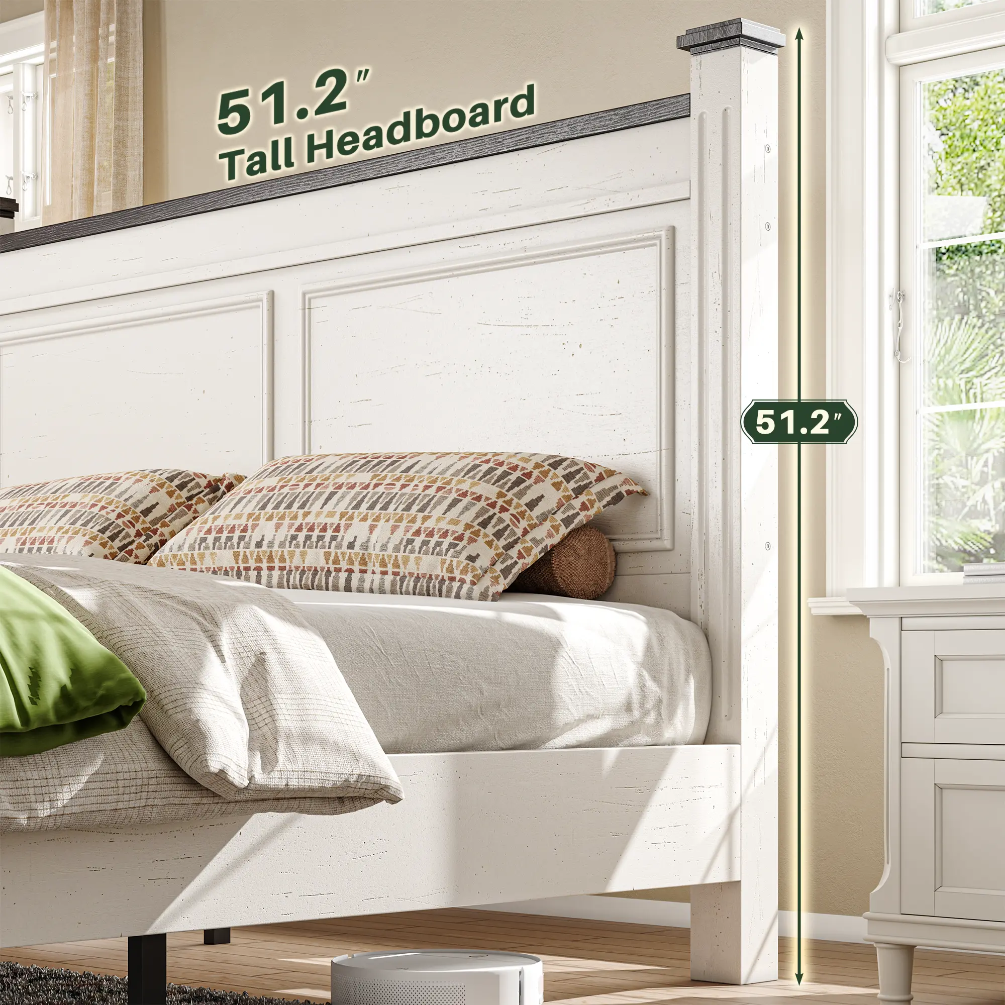 ·51.25"H adjustable headboard :Designed for comfort, the tall headboard offers full-angle support for reading or relaxing.No more worrying about the headboard of king bed not being high enough for lacking back support.