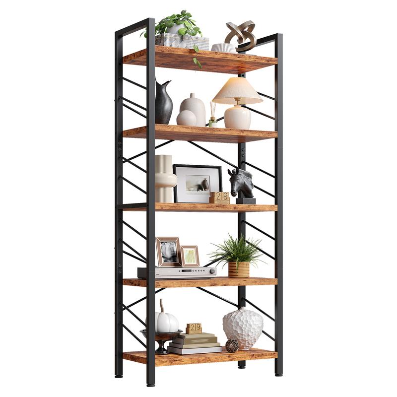 Elevate your space with our Industrial Five-Tier Corner Bookshelf. This modern display bookcase features a rustic brown and black finish. Perfect for bedrooms, living rooms, and home offices, it offers versatile storage solutions. The metal frame and sidebars add a sturdy structure. Adjustable feet ensure stability. 🛠️