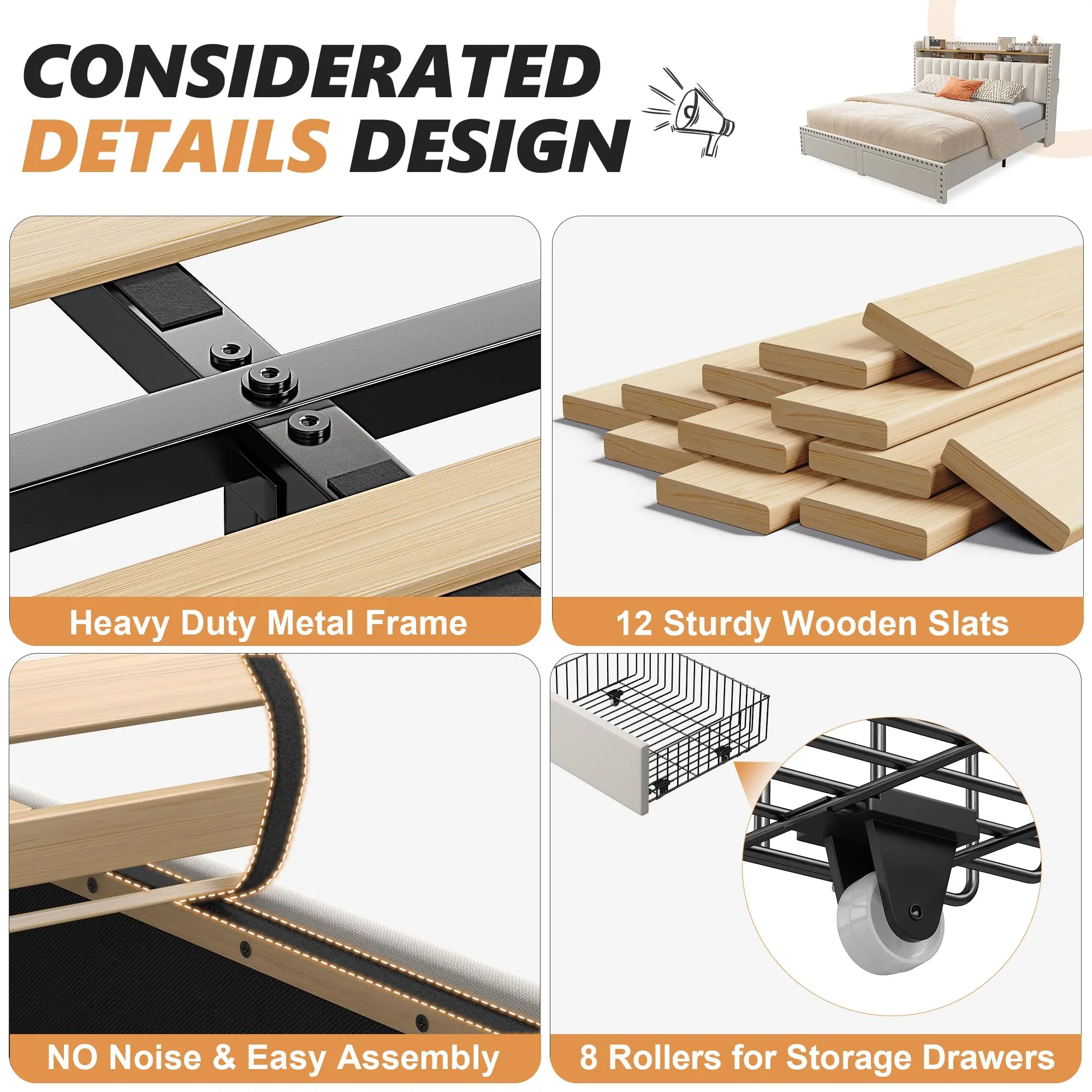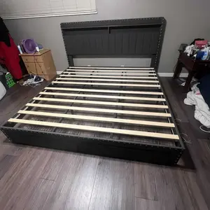 ·【NO Noise & No Box Spring Needed Queen Bed Frame with Headboard】 On the Soft bed frame with storage we made a mute sponge strip design, and we used the pasting method to fastened the supporting wooden slats to effectively prevent the bed frame with storage from creaking, our queen size bed frame ensure your healthy sleep. We don't need box Spring for this upholstered bed frame queen. This link is for queen size bed frame with storage only, mattresses need to be purchased separately.