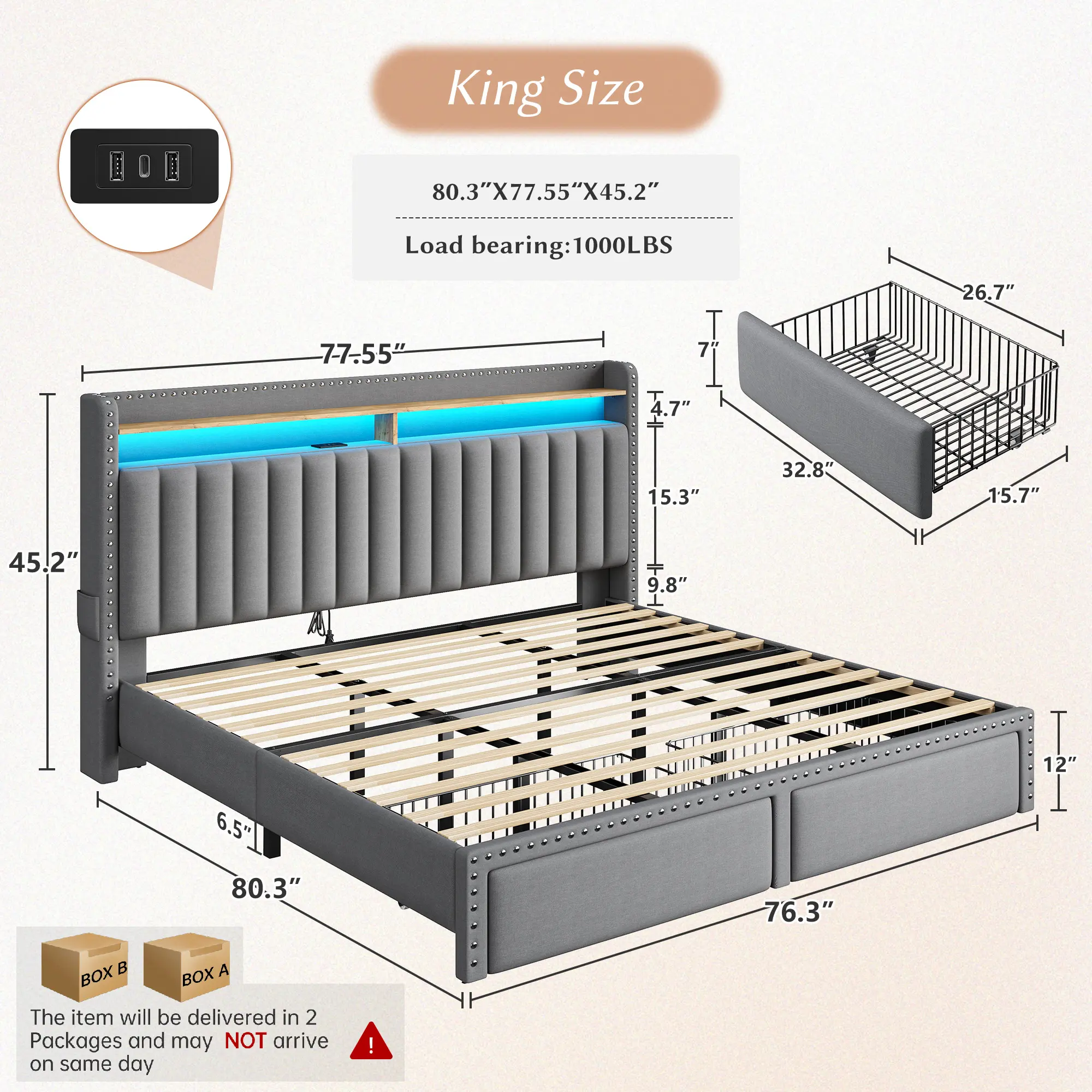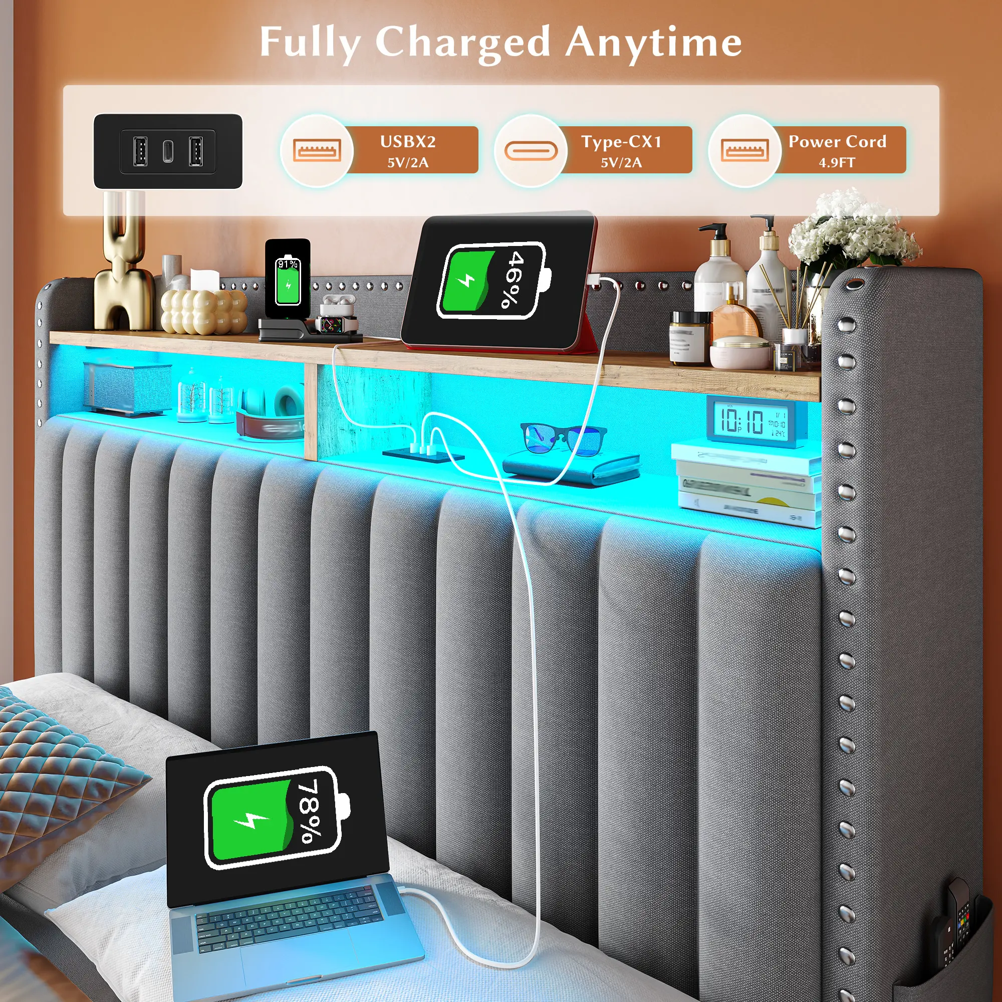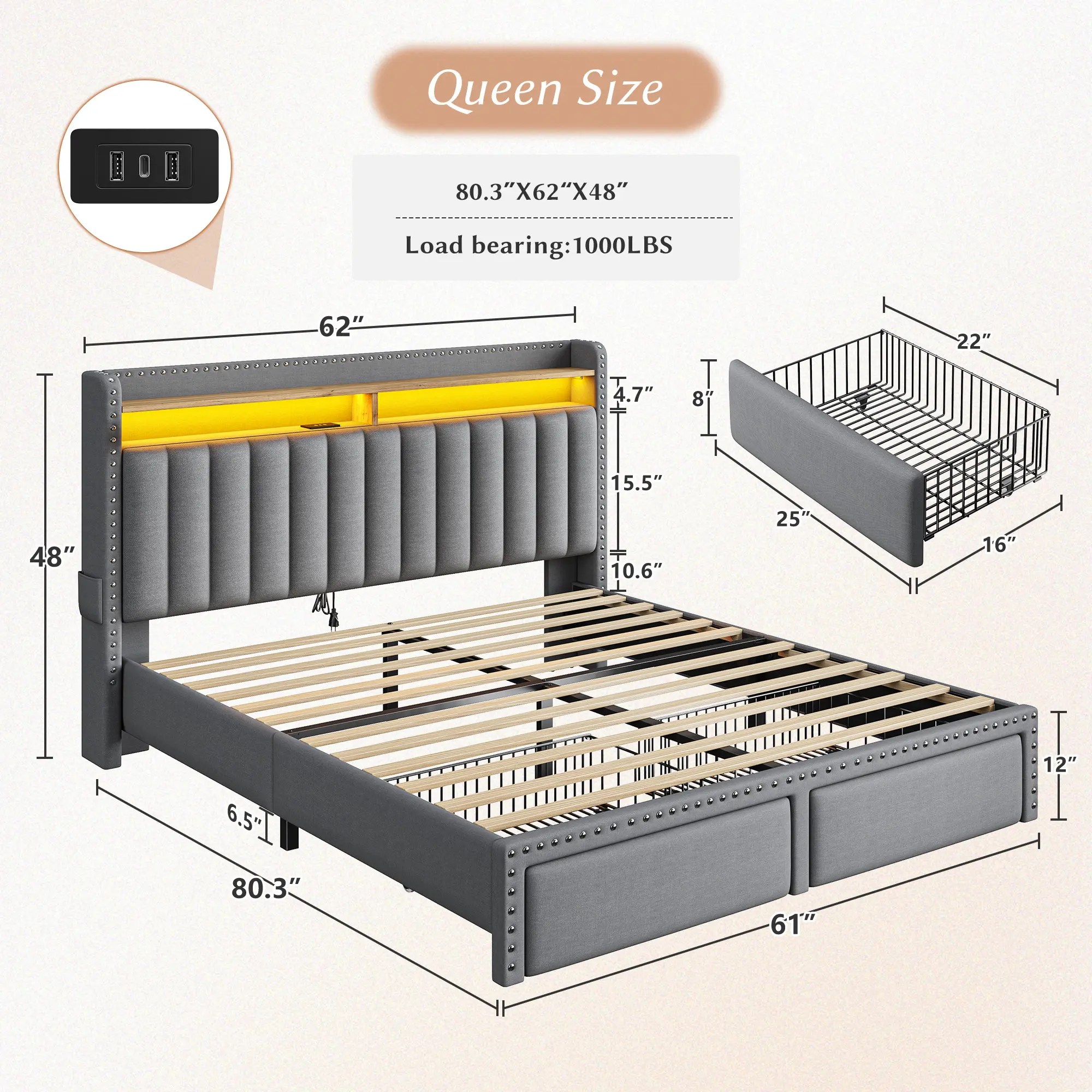 BUILT-IN LED LIGHTS & USB CHARGING STATION – Set the mood with customizable lighting and charge your devices without leaving bed. Your phone will thank you.