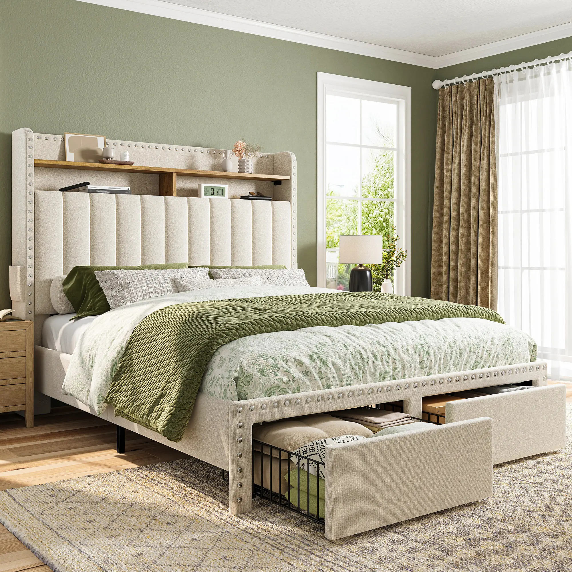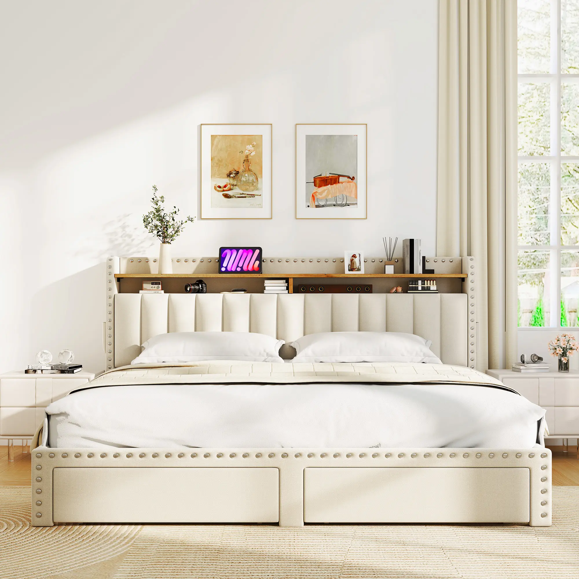 Elegant Upholstered Bed Frame with 2 Storage Drawers