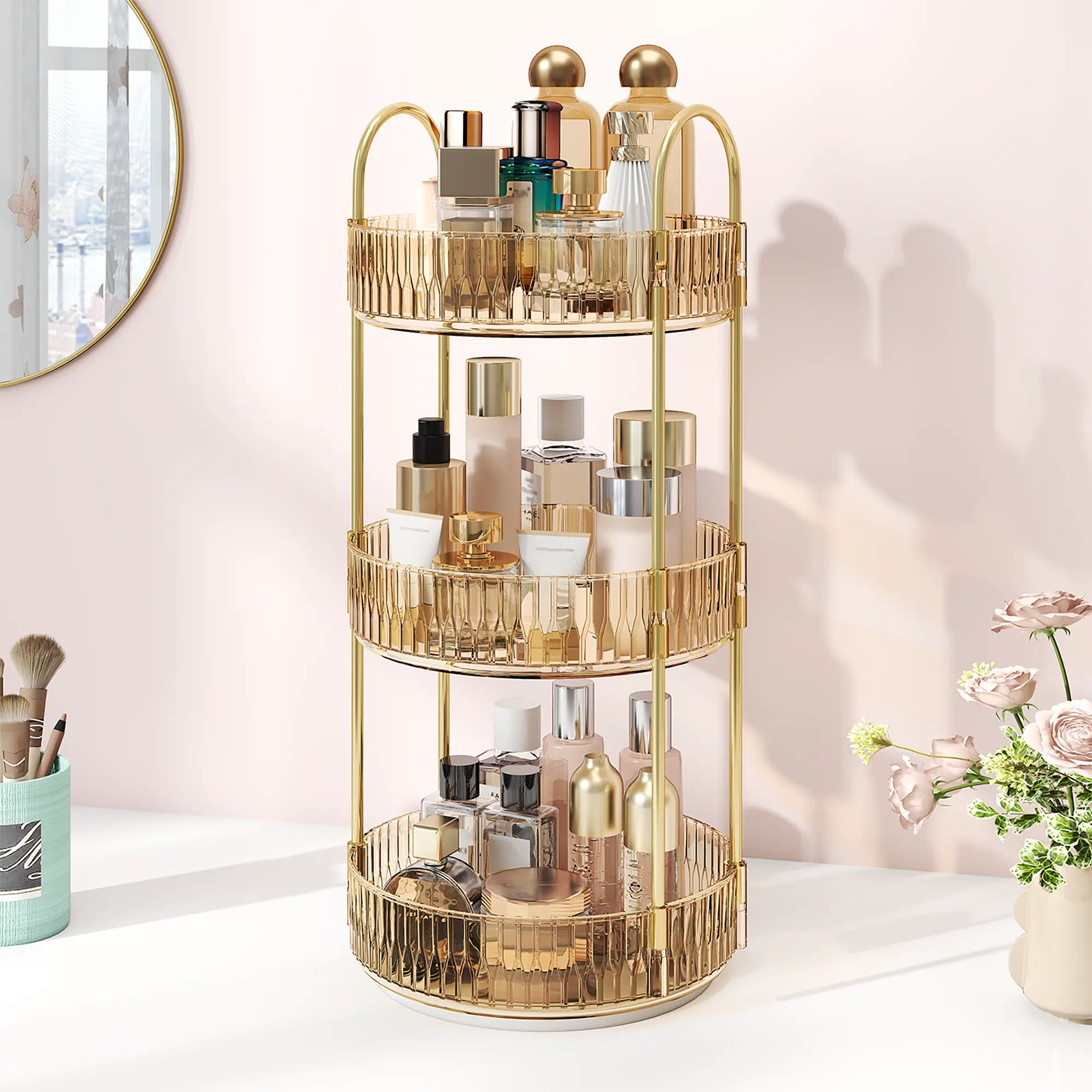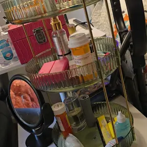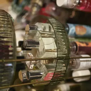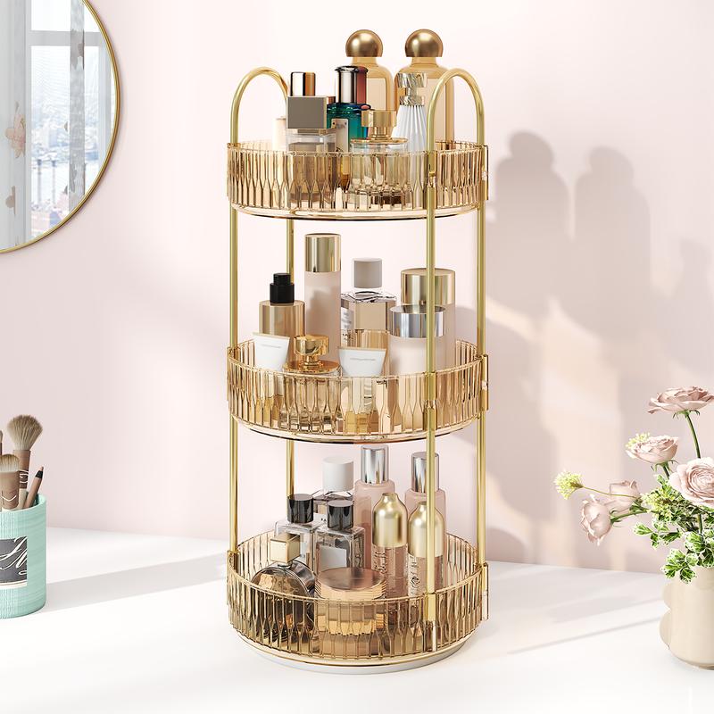 ·【360° Rotating Design】Unlike conventional make up organizers, this innovative rotating vanity organizer boasts a seamless 360-degree rotation capability. With just a gentle rotation, you can effortlessly access all your makeup essentials, making the selection process a breeze. The perfume organizer's high tray edge are thoughtfully designed to prevent any messy spills.