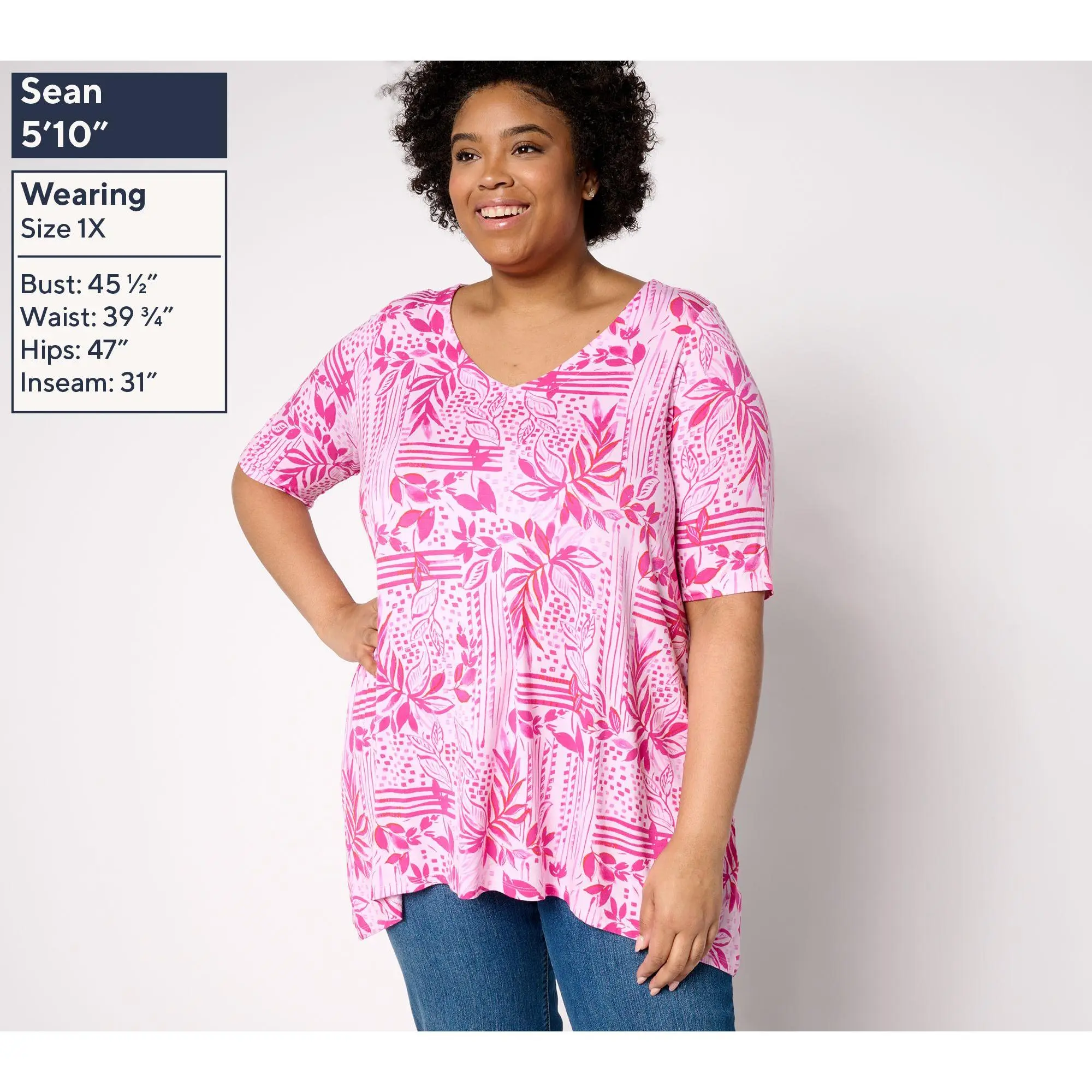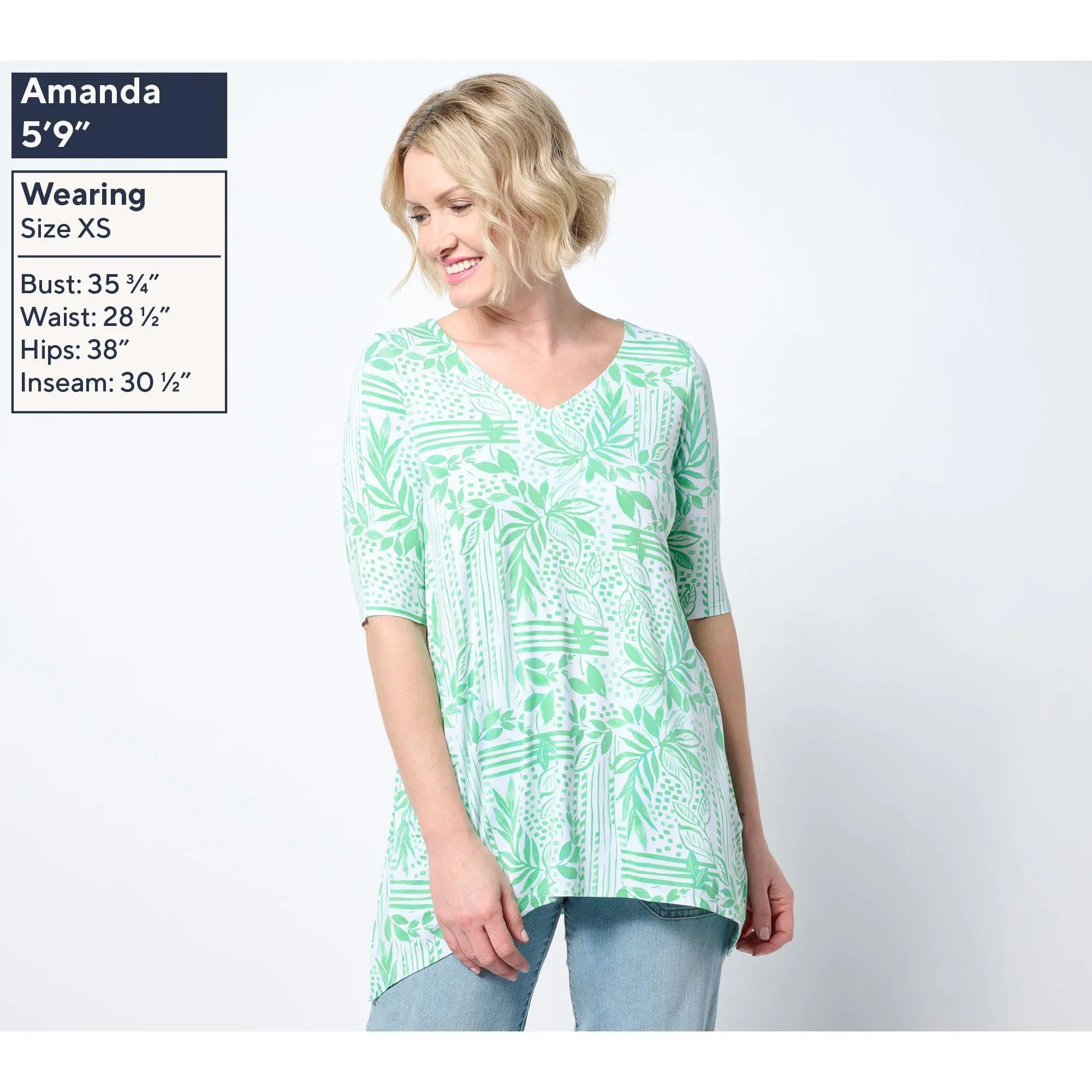 Belle by Kim Gravel Rayon Spandex Paradise Elbow Sleeve Tunic. Elbow Sleeve V Neck Knit Top with trapeze hem. Semi-Fitted, follows the lines of the body with added wearing ease. Missy Length: 27 1/2"- 29 5/8". Plus Length: 30"-33 1/2". Content: 93% Rayon, 7% Spandex. Care: MWCDC/WS/ONCBWN/LD/LIIN. Imported.