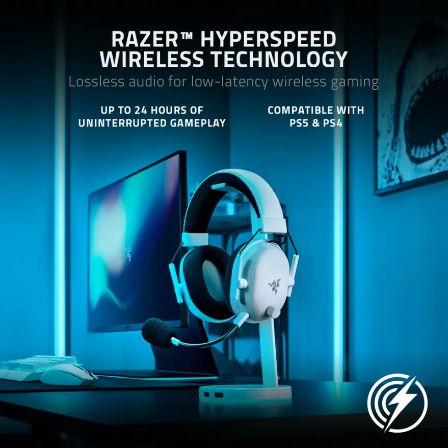 Razer™ HyperSpeed Wireless Technology ensures maximum responsiveness and reliability. With a 2.4GHz connection, you get high-performance, low-latency competitive play. Sound is perfectly synced to your game, enhancing your performance.
