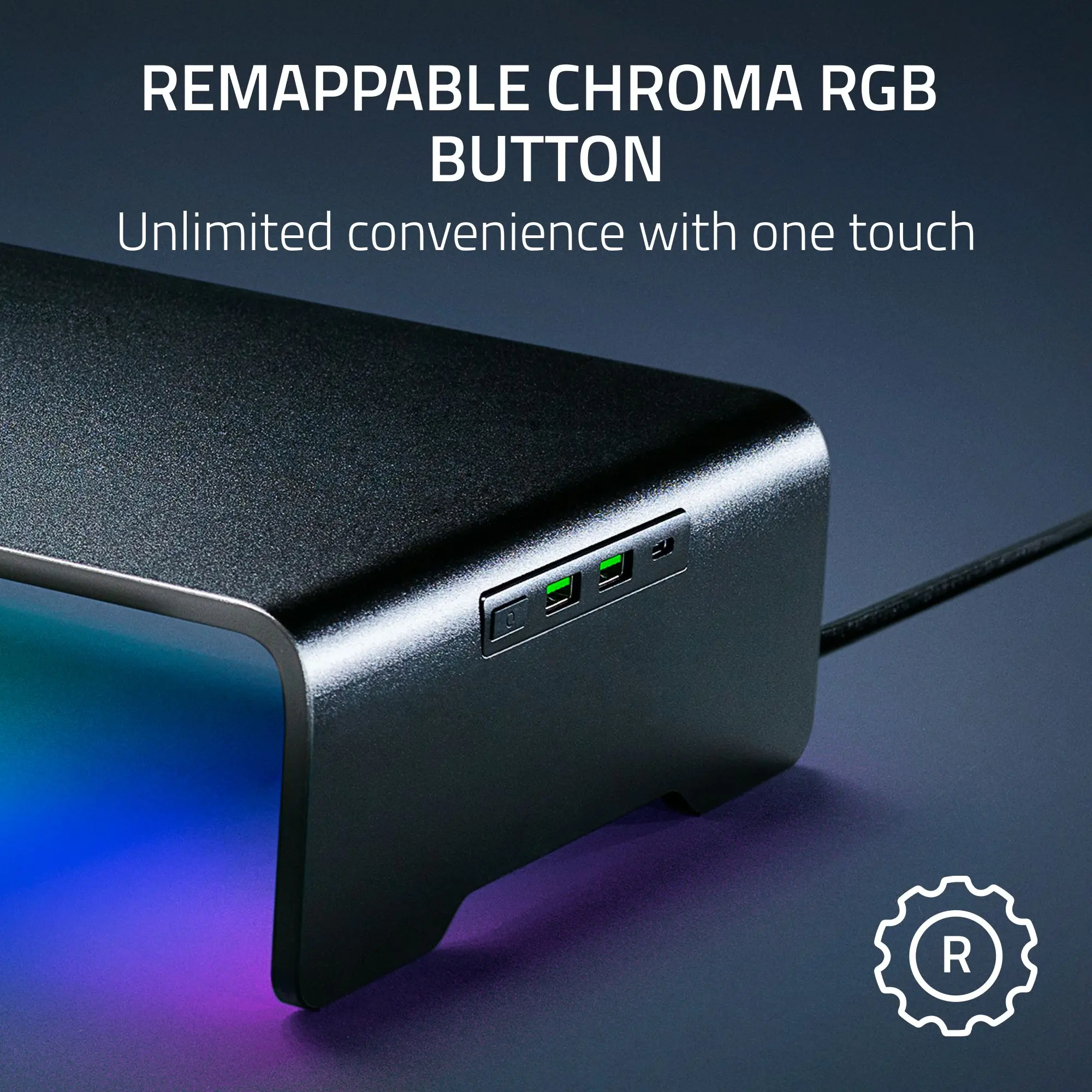 Enjoy the flexibility of the remappable Chroma RGB button. It offers unlimited convenience with just one touch. Upgrade your gaming experience with this innovative monitor stand. The stand seamlessly integrates technology with aesthetics, ensuring both style and practicality in one product.