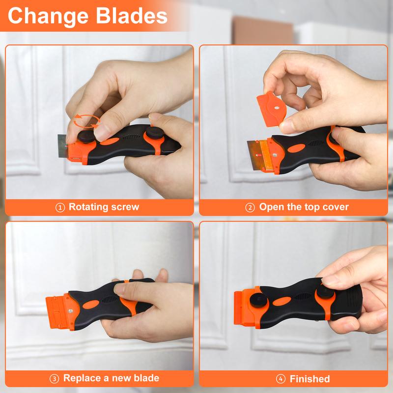 ·ăEasy Blade ReplacementăReplacing blades has never been easier! Our scraper features an intuitive design for effortless blade replacement. Simply loosen the knob, remove the top cover, and replace the blade to keep the scraper performing at its best. The scraper comes with 20 plastic blades and 10 metal blades, ensuring you always have the right tool for any cleaning taskâplease remember to handle metal blades with care!