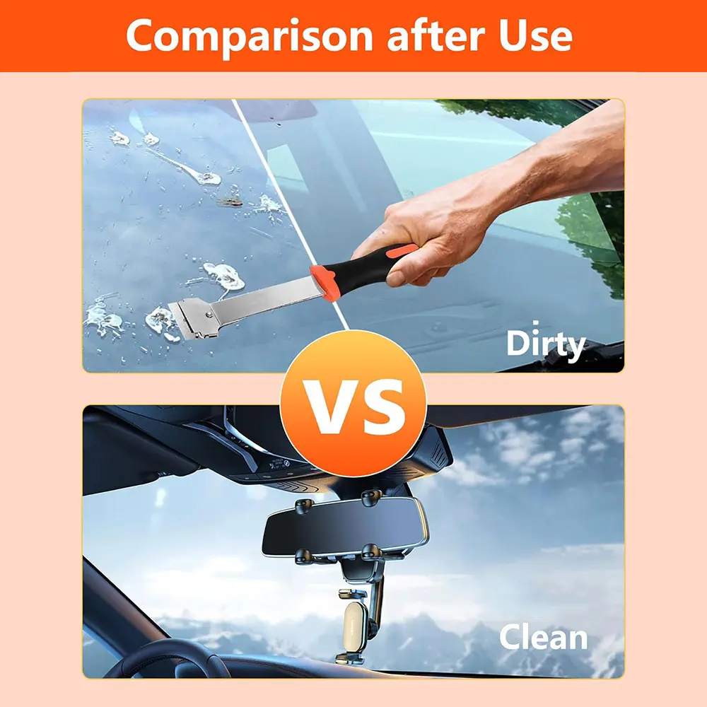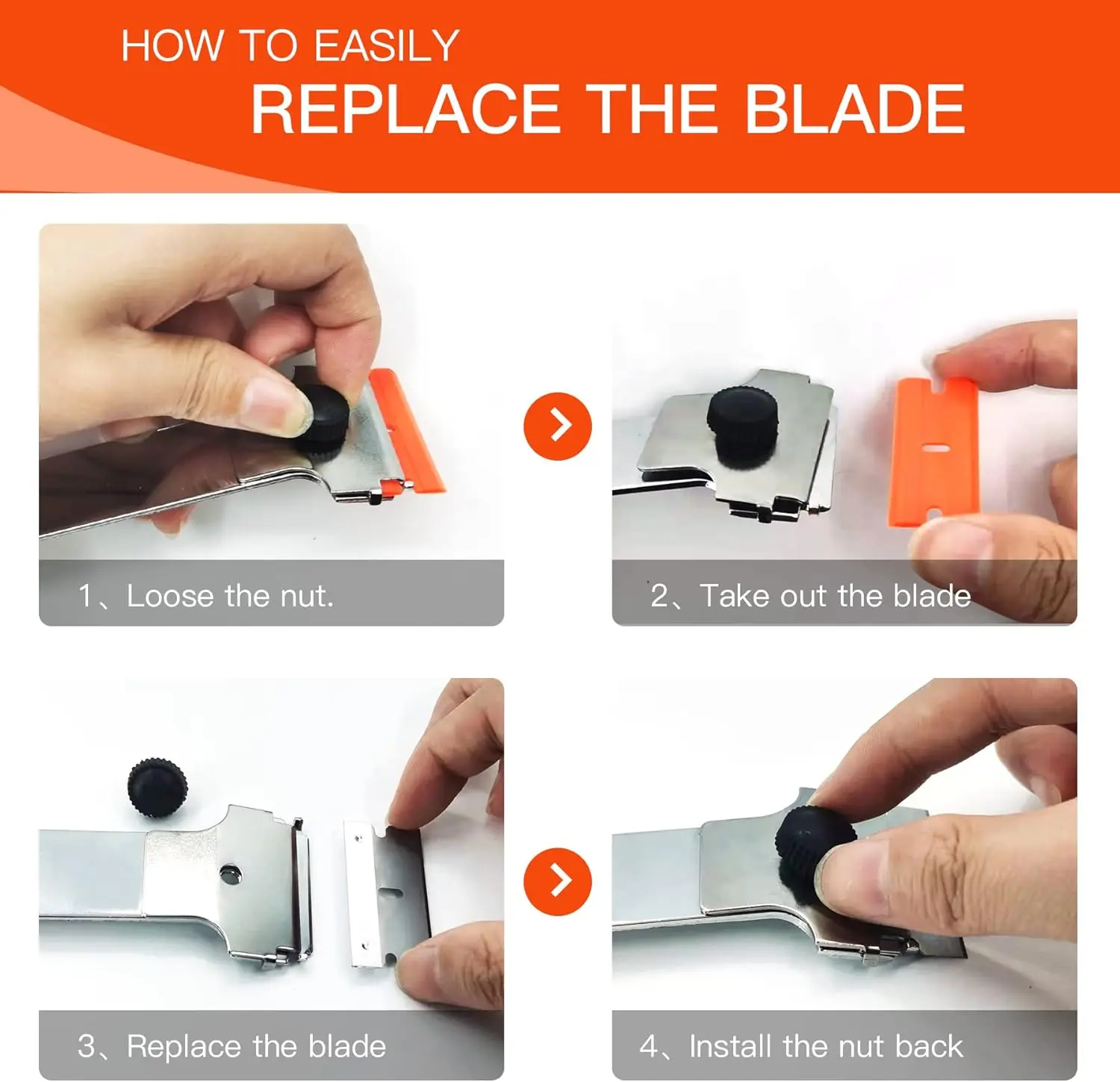 ·[Long Handle Scraper Tool] - The handle of windshield sticker remover is 9.06inch/23cm with 1.58inch/4cm wide blades, which is perfect for working on hard to reach places. With hand knob tightening screw, easily change of razor blades without any tool anywhere