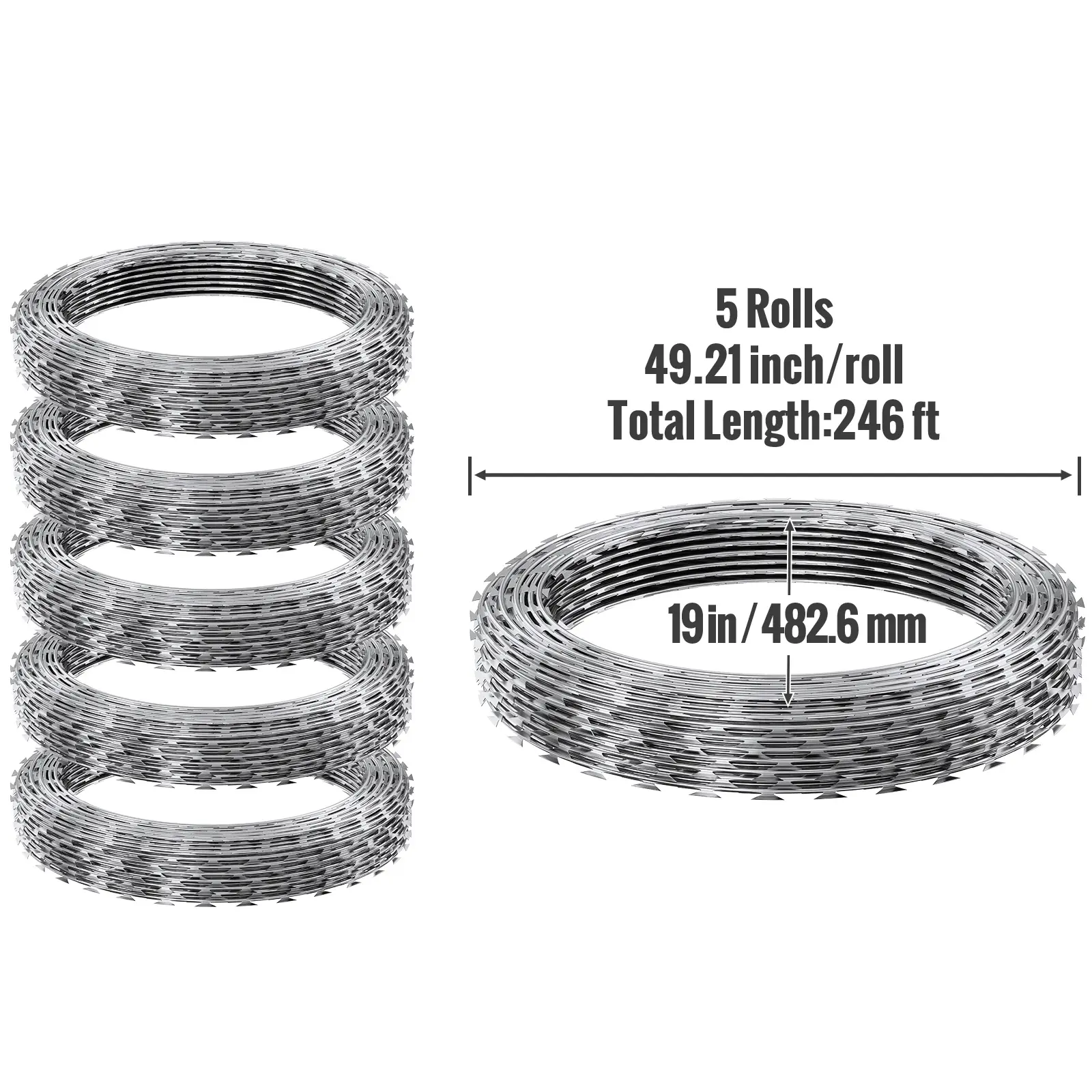 • 246 FT Coverage: Our razor fence comes in 5 rolls, offering a total coverage of up to 246 ft. Each roll has a diameter of approximately 19", with around 31 coils per roll. It easily meets your security needs. Please check local regulations and obtain the necessary permits before installation.