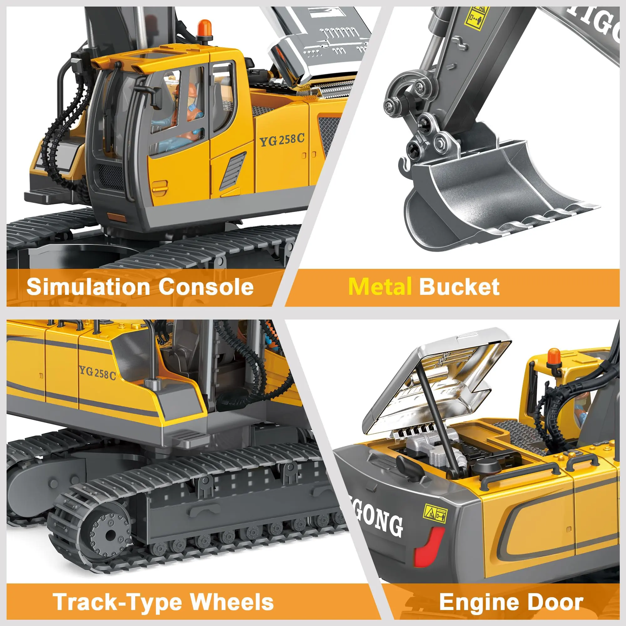 The excavator offers in-situ 360° and cab 680° rotation for versatile gameplay. It features a 2.4 GHz frequency for superior control, making operation simple and preventing confusion. Kids can play with multiple RC vehicles together, enhancing their experience.