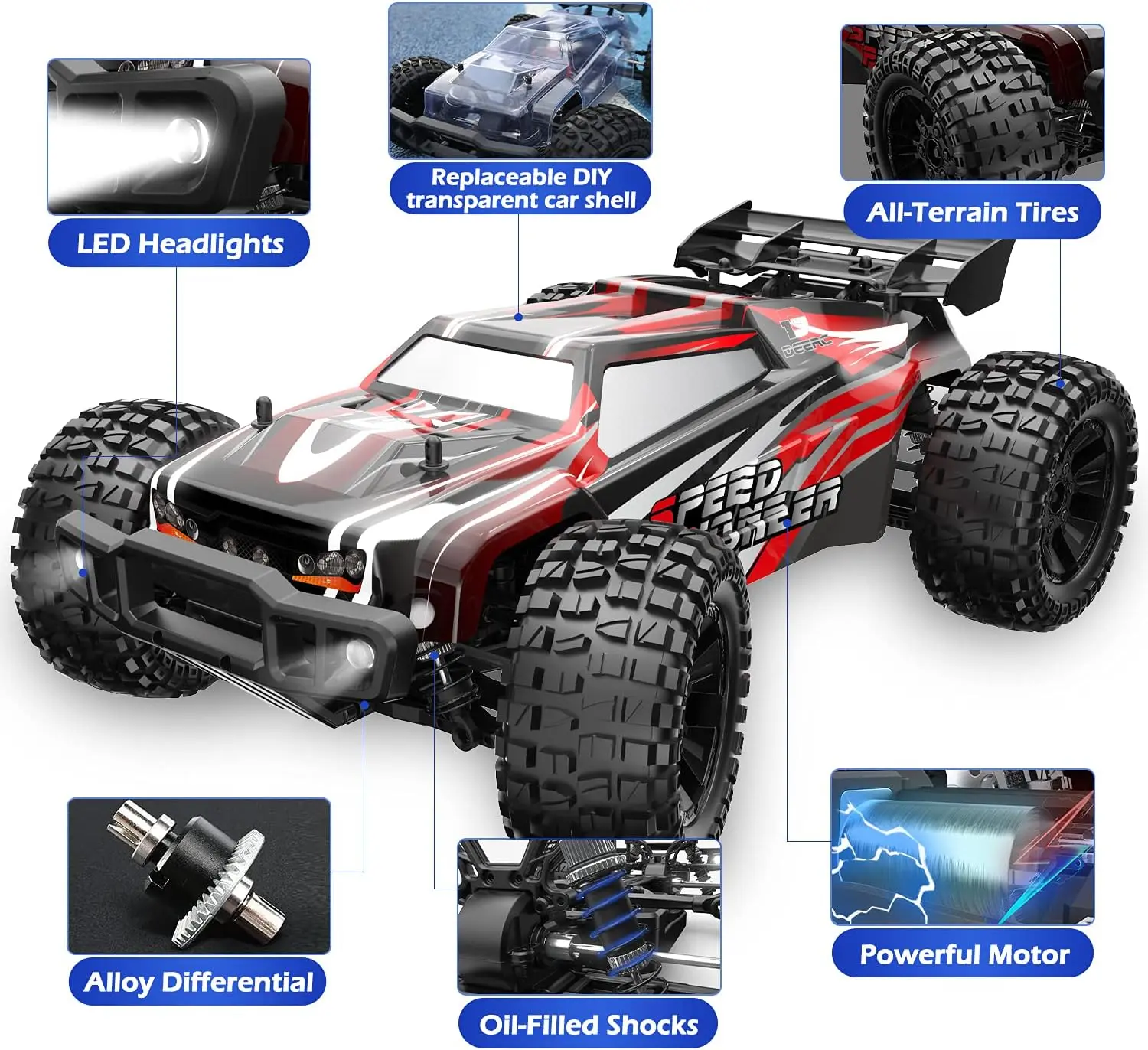 Unmatched Durability – Built to last, this RC car features a robust metal drivetrain with upgraded components like metal dog bones, differentials, and gears. Its ultra-durable composite chassis withstands harsh impacts and rugged terrain, offering 50% more durability than traditional models.
