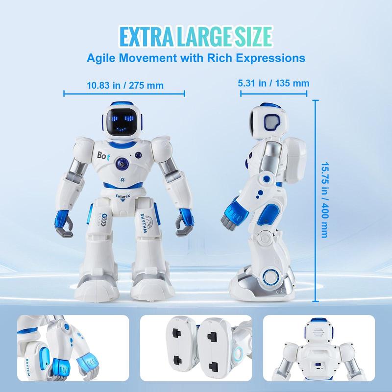 ·Extra-Large Size: The extra-large kids robot features flexible joints at the shoulders, elbows, and thumbs, plus smooth wheels for versatile movements. With 10 different emoji expressions, it's packed with personality and fun, making it a great companion for kids.