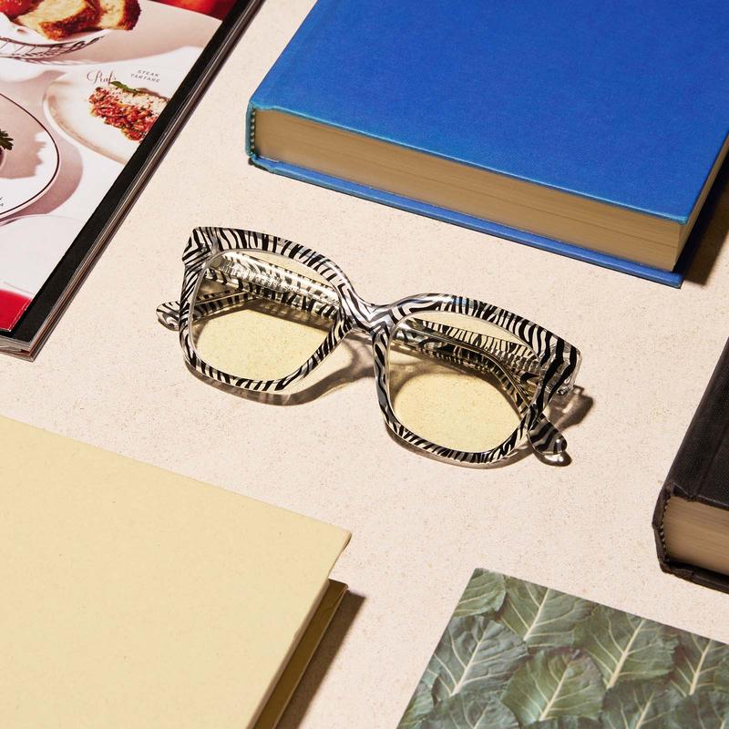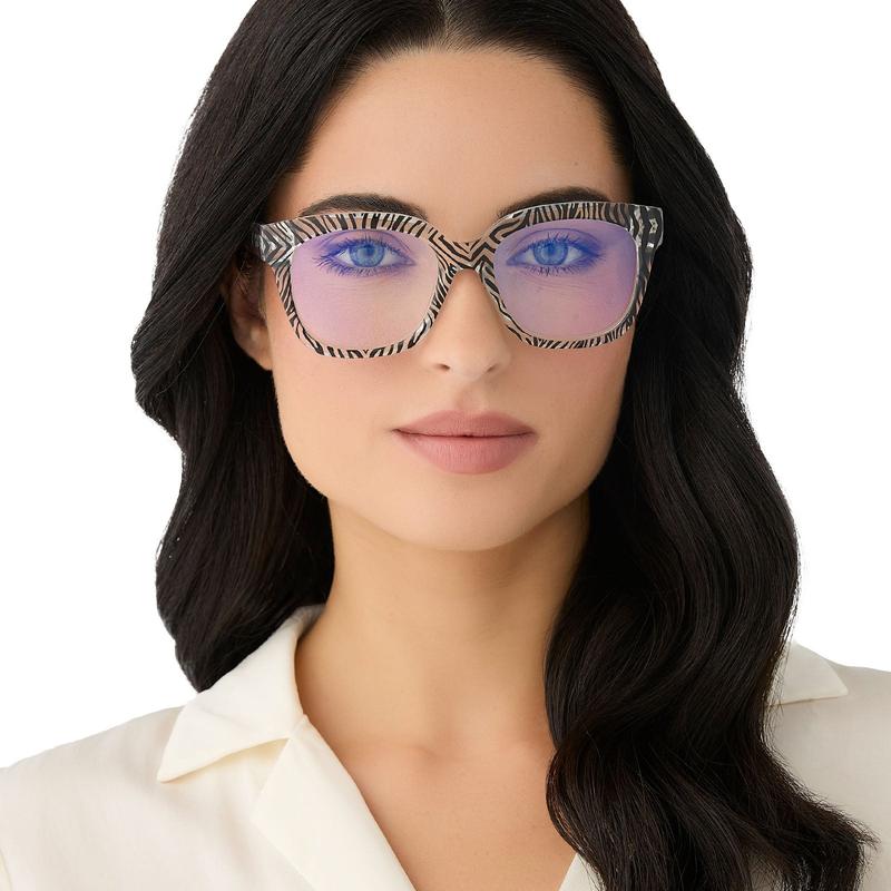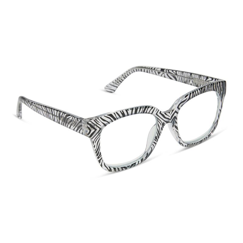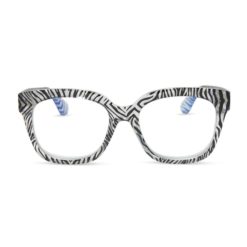 The AVA - ZEBRA + BLUE LIGHT READERS offer a distinctive and stylish design with a chunky square frame, pronounced temples, and a dipped bridge. The zebra pattern and blue light filtering feature make them a practical choice for those who spend a lot of time on screens.