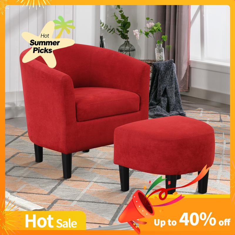 Ebello 26" Wide Modern Upholstered Barrel Accent Reading Chair with Foot Rest and Ottoman, Red