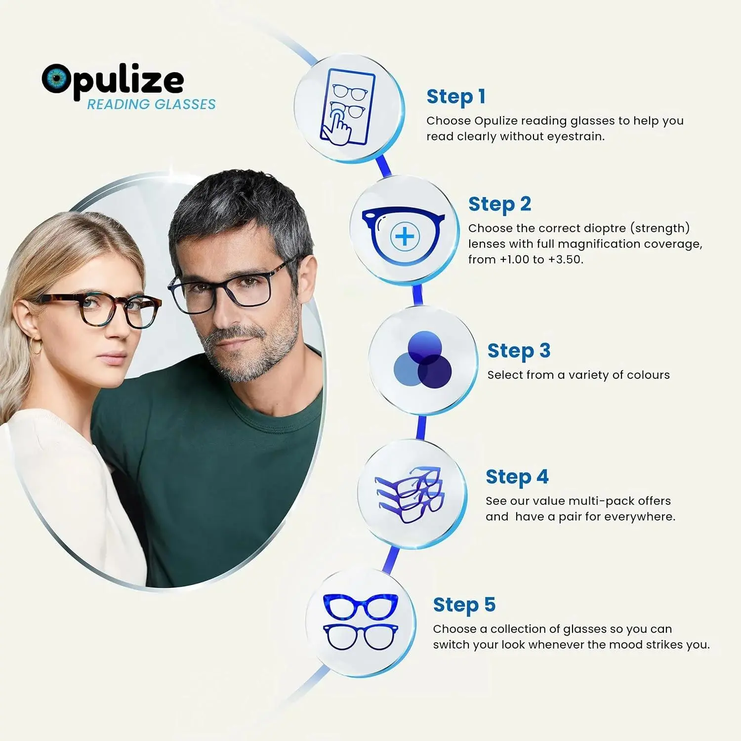 QUALITY AND STYLE - Opulize reading glasses offer incredible value while committing to a classic design. This popular style remains one of our best sellers. A PAIR OF GLASSES FOR EVERY PLACE - Do you always lose your glasses or are they never in the right place at the right time? Now with Opulize's amazing mounts you can have a pair in every place. COMFORTABLE FIT - These large, sturdy and easy-to-wear frames with contrasting arms and spring-loaded hinges make Opulize INK a perfect choice. This universal shape provides a perfect fit for most face types. COLORS: Black front with blue bones, transparent grey front with black bones, transparent dark red front with black bones. GRADUATION : +2.50