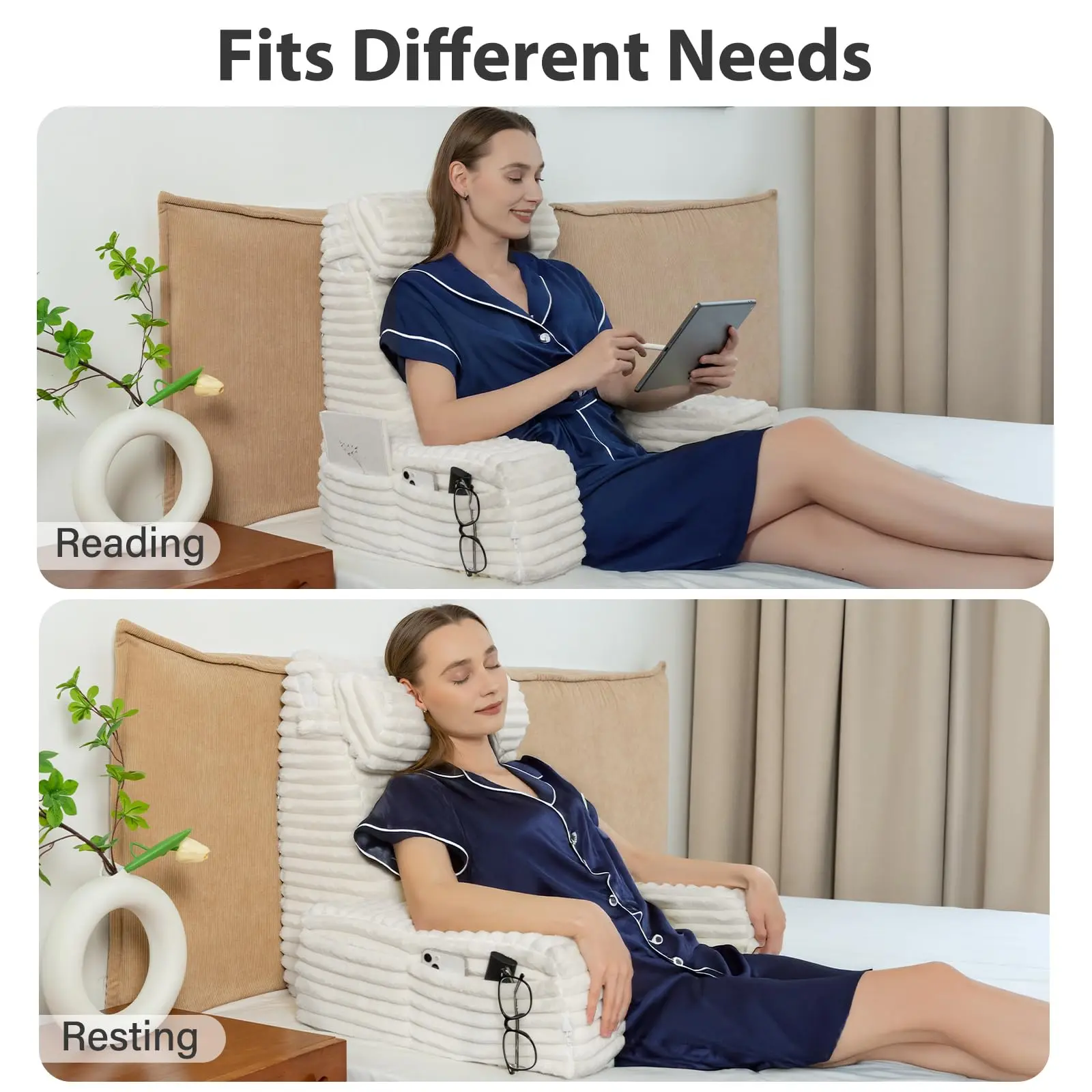 ·[Premium Materials]: Our sit up pillow for bed comes with a plush faux fur cover that offers exceptional softness and comfort. It’s designed to provide a cozy, indulgent experience like no other back pillow you've tried. And the cover is machine washable, making it easy to keep clean and maintain its luxurious feel.