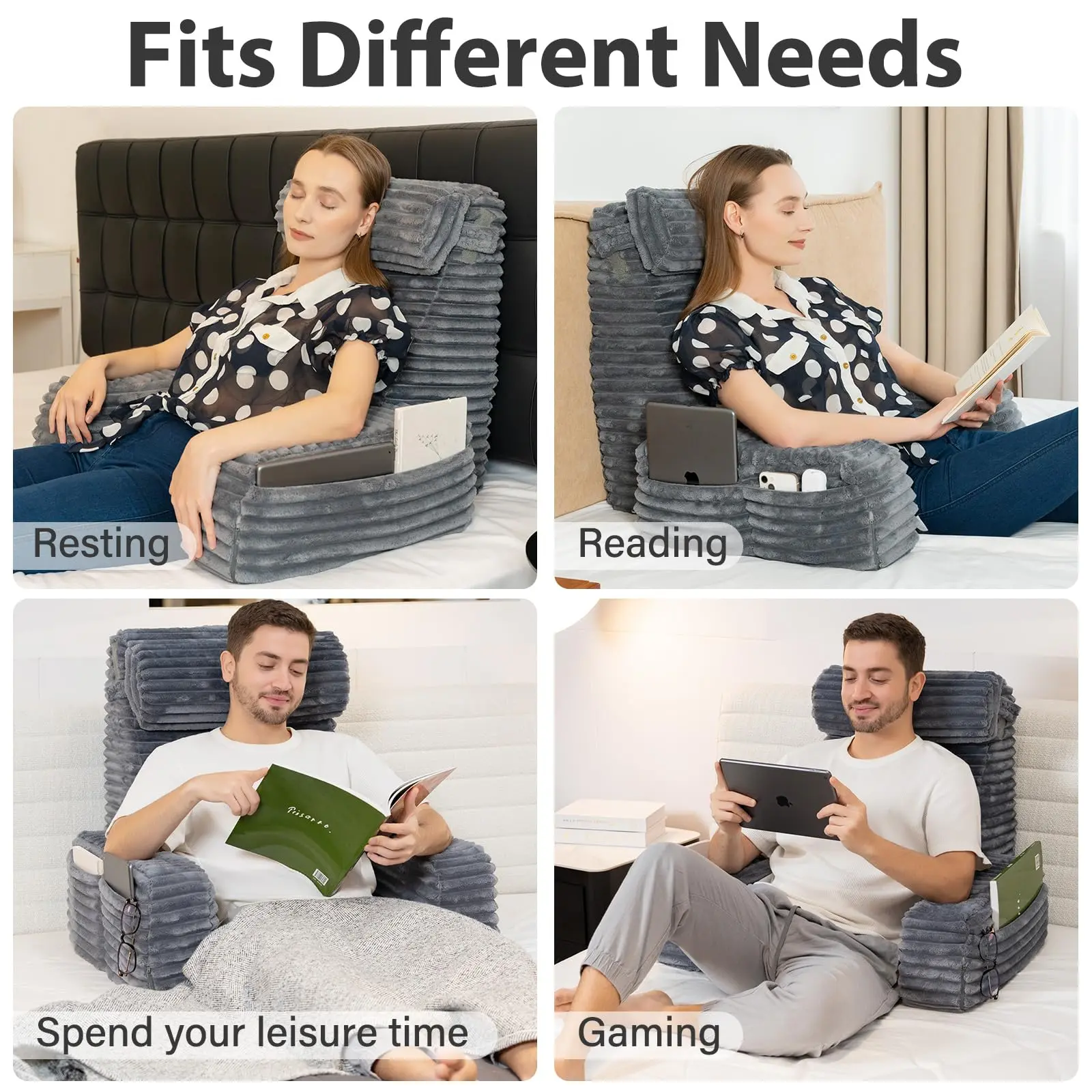 ·[Extra-Large Storage Pockets]: Our back pillow for bed sitting up features extra-large storage pockets on both sides are perfect for storing books, phones, remote controls, and more, keeping your essentials within easy reach. And a handle design for effortless portability, allowing you to move it around with ease.