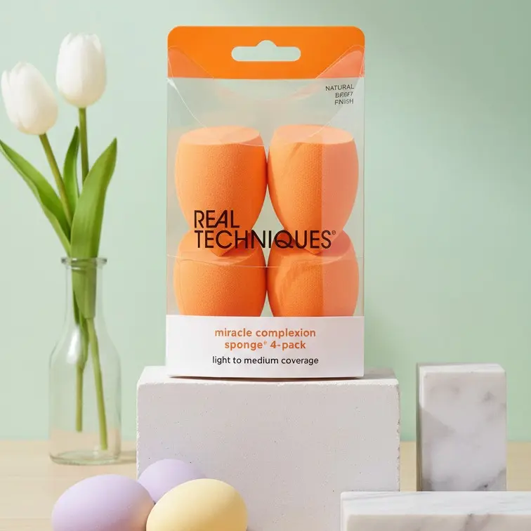 The sponge is easy to clean with Real Techniques Brush + Sponge Cleansing Gel. It is 100% cruelty-free, vegan, and designed with revolutionary latex-free foam technology. The orange color and egg-shaped configuration with a pointed tip and angled portion are trademarks of Paris Presents Incorporated.